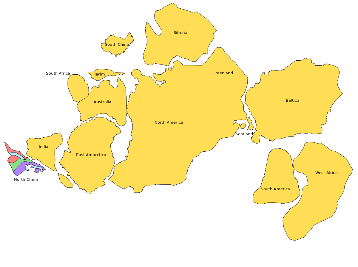 4. 북중국 강괴는 컬럼비아 초대륙과 충돌하여 변형과 변성 작용을 일으켰다.[12][11] (Kusky, 2011[12] 및 Kusky, 2003[11]에서 수정됨)