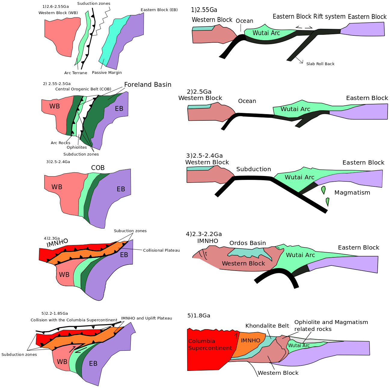 - 북중국 강괴 합쳐진 후, 약 23억 년 전 강괴 북쪽 가장자리가 열도 지층과 충돌하며 서부 지각괴의 내몽골-허베이 조산대가 형성되었다.[75]