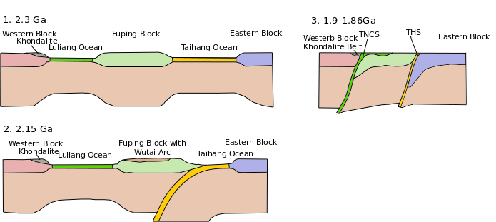 Faure와 Trap은 연대 측정 및 구조 증거를 바탕으로 횡-북중국 조산대가 푸핑 블록이라는 분리된 블록이라고 주장했다.[22][23][24] 이들은 21억 년 전 타이항 해가 닫히면서 동부 블록과 푸핑 블록이 합쳐졌고, 19억~18억 년 전 뤼량 해가 닫히면서 동부 및 서부 블록이 합쳐졌다고 주장했다.[22][23][24]