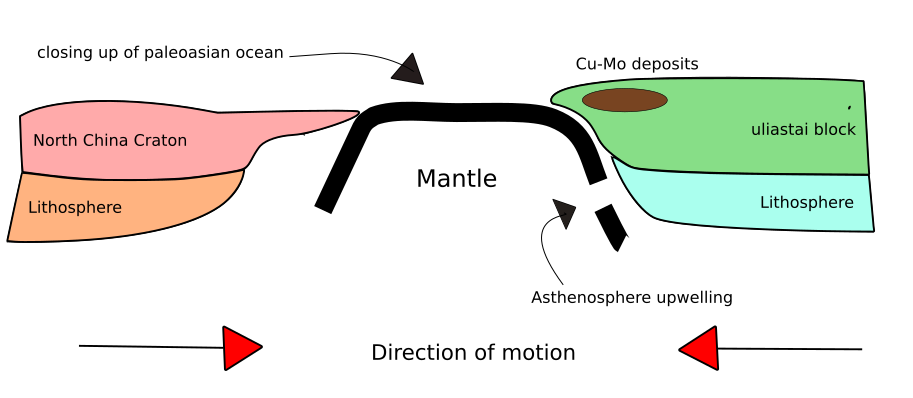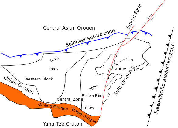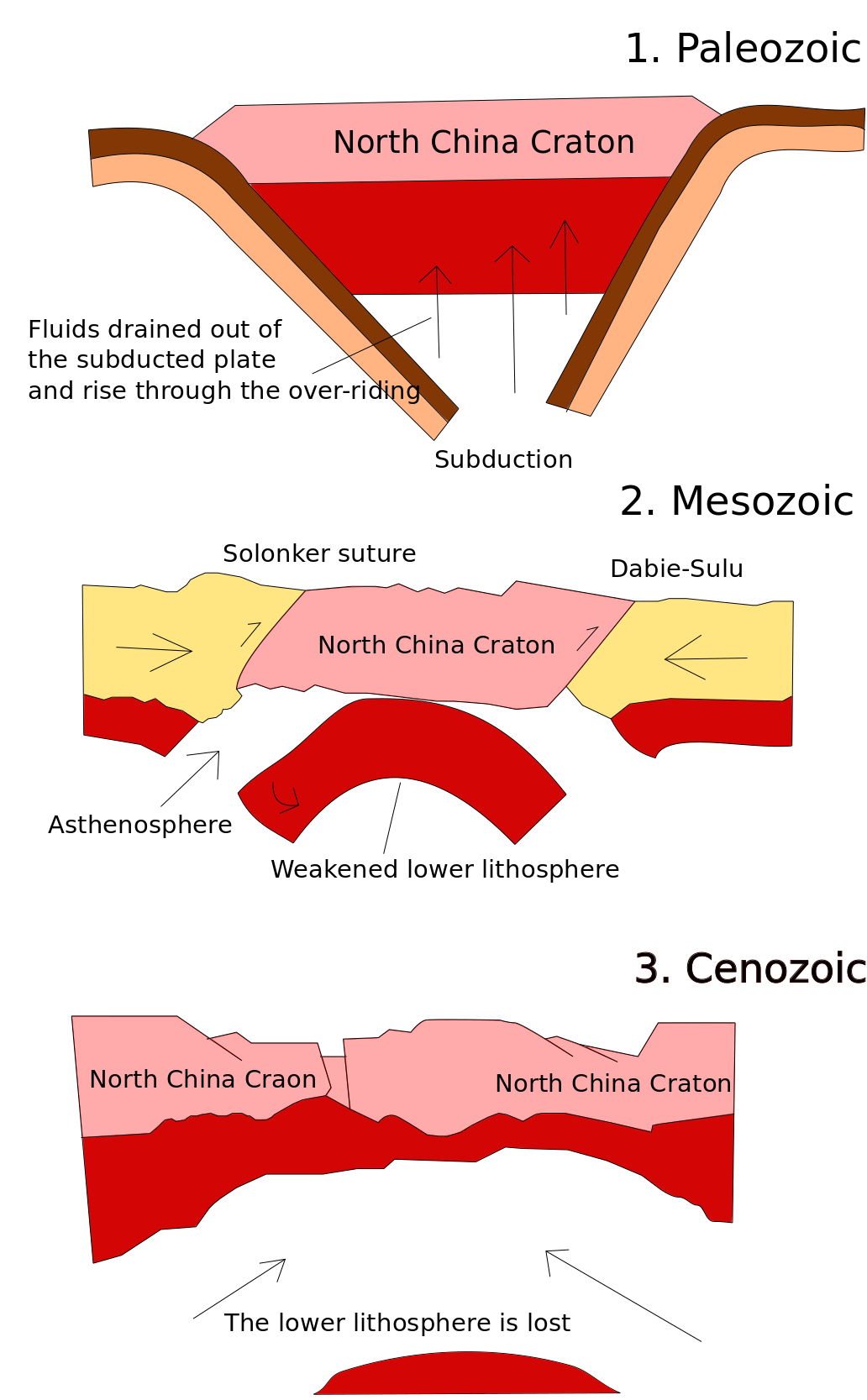 - 석탄기~중기 쥐라기 고아시아 해 섭입 및 폐쇄, 후기 트라이아스기 양쯔 강괴의 북중국 강괴 아래 섭입,[29][28][36][30] 쥐라기와 백악기 고태평양 판 섭입 등 현생누대 동안 광범위하게 발생했다.[7][27]
