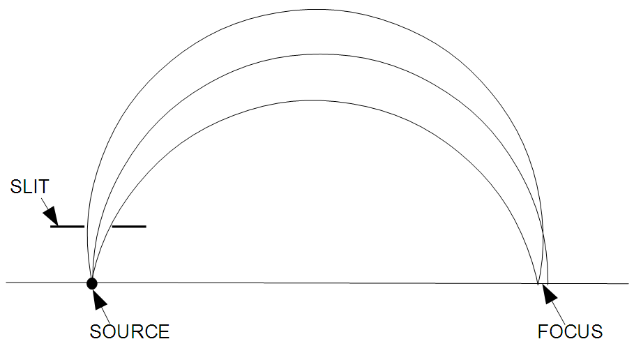 여기서 ''m''과 ''v''는 입자의 질량과 속도이다.[7] J. K. Danisz가 발명한 가장 오래되고 간단한 자기 분광기인 반원형 분광기의[8][9] 초점 원리는 왼쪽에 나와 있다. 일정한 자기장은 페이지에 수직이다. 슬릿을 통과하는 운동량 ''p''의 대전 입자는 반지름 ''r = p/qB''의 원형 경로로 휘어진다. 이 입자들은 모두 거의 같은 지점인 초점에 있는 수평선에 도달하는데, 이곳에 입자 계수기를 설치해야 한다. ''B''를 변화시킴으로써 알파 입자 분광기의 알파 입자 에너지 스펙트럼, 베타 입자 분광기의 베타 입자[10], 입자 분광기의 입자(예: 고속 이온) 또는 질량 분석기의 다양한 질량의 상대적 함량을 측정할 수 있다.