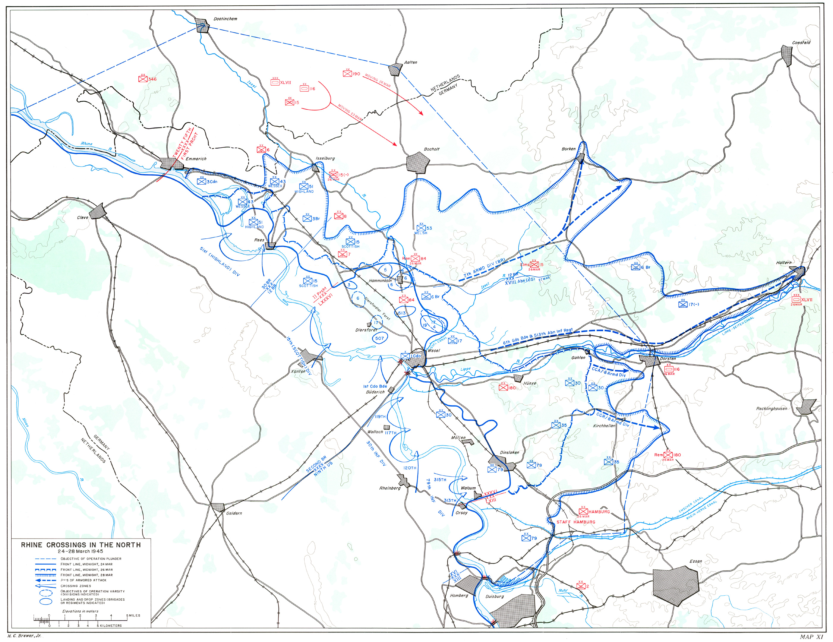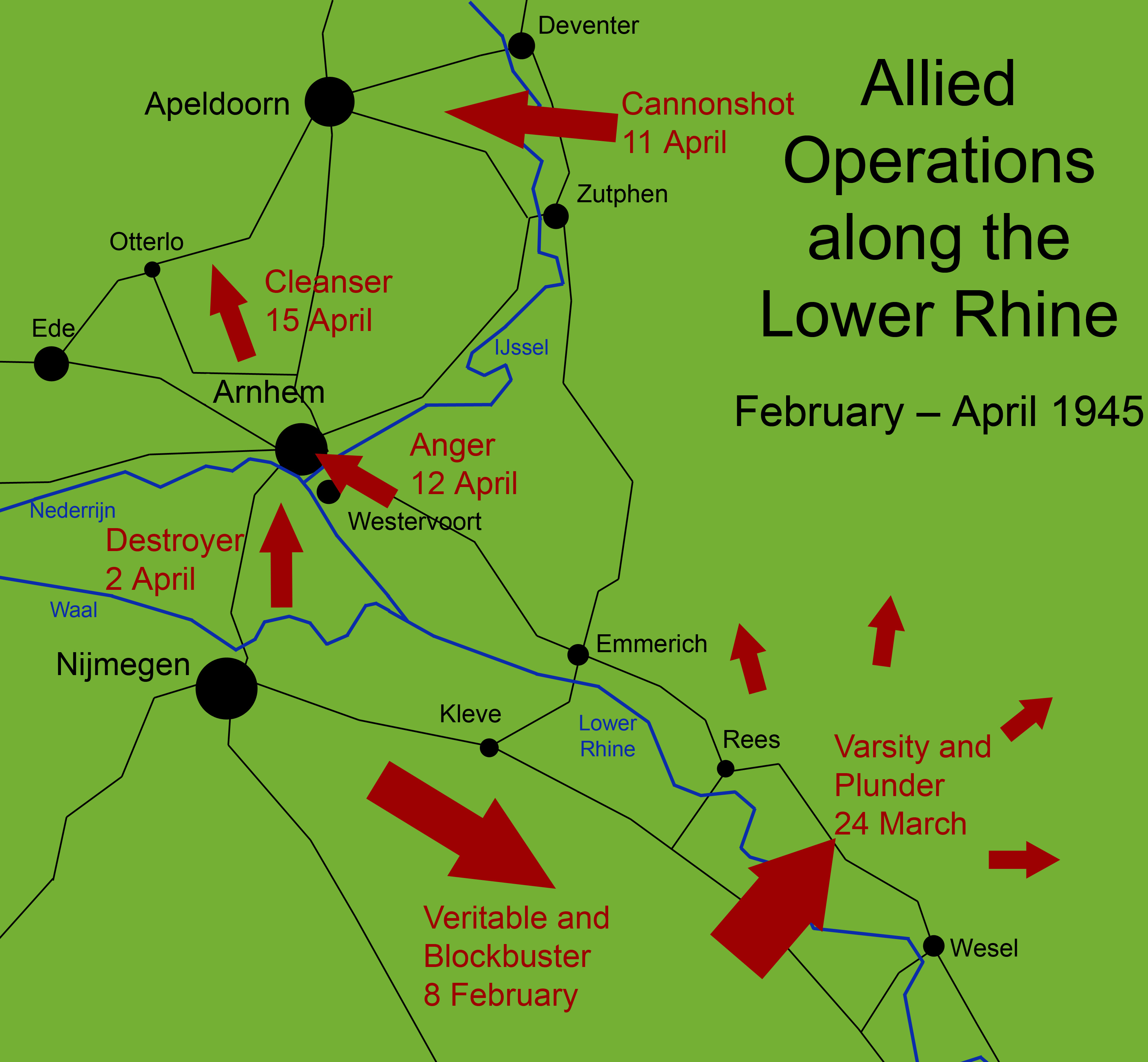 1945년 2월, 작전 버리터블과 작전 그레나데를 통해 연합군은 마켓 가든 작전 중 확보한 교두보에서 독일 본토로 진격을 개시했다. 이 성공적인 작전들은 라인강 상류를 도하하는 작전 플런더와 작전 버시티로 이어졌고, 제21군집단은 독일 북서부로 빠르게 나아갔다. 이 과정에서 영국 제2군이 동쪽으로 진격하는 동안, 헨리 크레러 장군이 이끄는 제1 캐나다군은 네덜란드 해방 임무를 부여받았다.[6]