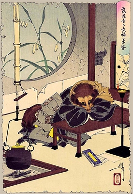 주지와 그의 견습생들이 그것을 제압하고, 보통의 찻주전자 형태로 돌아가기 때문에, 그들은 여행하는 땜장이에게 판매하였다. 찻주전자는 장사꾼에게 반 너구리 모습을 드러내고, 상인은 친구의 조언에 따라 그 짐승에게 속임수를 쓰도록 명령하거나, 잘 대해주는 대가로 곡예를 하겠다고 흥정하는 너구리 자체에 설득당한다. 행상인은 그것을 뜨거운 불에 두거나 퀴퀴한 상자에 넣어두지 않고, 자신이 가진 음식을 나누어 먹기로 동의한다.