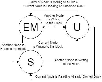 블록이 디렉터리 조직으로 들어오면 초기 노드에서 U에서 EM (소유 상태)으로 전환된다. 다른 노드가 블록을 읽기 시작하면 상태가 S로 전환될 수 있다.[2] 블록은 노드 중 하나가 EM 상태에 있는 경우 "소유"된다.