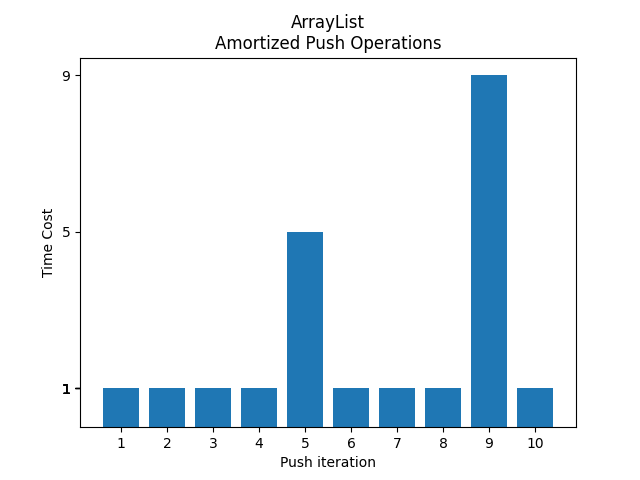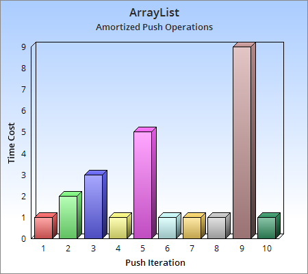 일반적으로 초기 크기가 정해진 배열에 n번의 푸시 연산을 수행하면 배열을 두 배로 늘리는 단계의 시간은 기하 급수로 O(n)이 되고, 나머지 푸시 연산의 상수 시간도 O(n)이 된다. 따라서 푸시 연산당 평균 시간은 O(n)/n = O(1)이므로, 분할 상환 분석을 통해 전체적인 삽입 연산의 평균 비용은 상수 시간(O(1))임을 알 수 있다.[8]