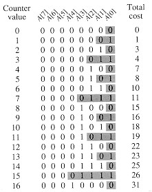 이렇게 하면 카운터의 모든 1은 자신 위에 1USD의 크레딧을 가지게 되고, 비트를 다시 0으로 만들 때는 추가 비용이 필요 없다. 즉, 비트를 0으로 만들 때는 그 비트 위에 있는 1USD로 비용을 지불하면 된다.