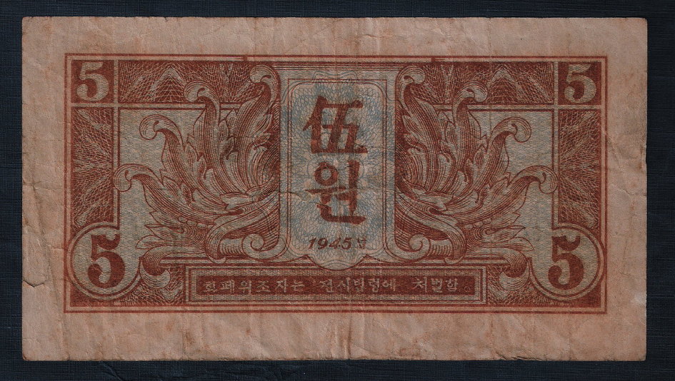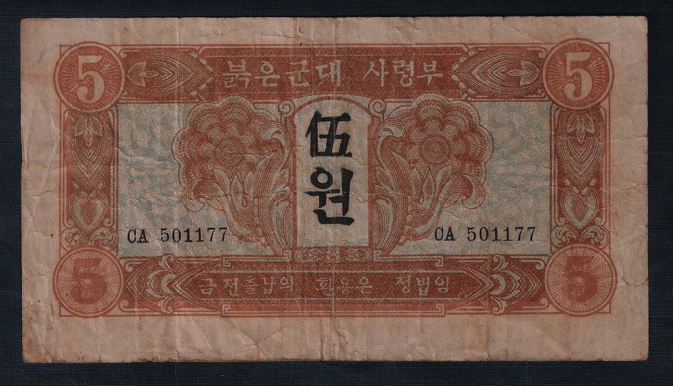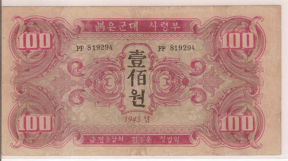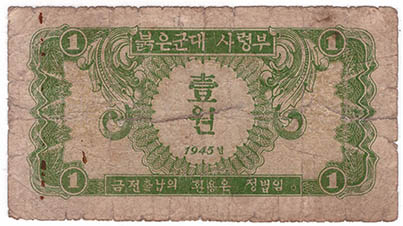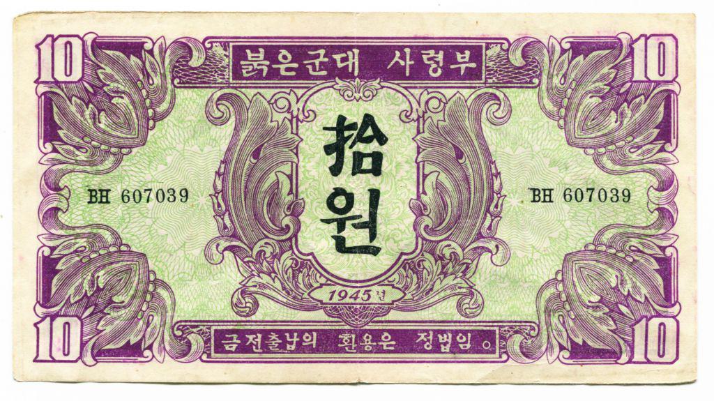 1945년 8월, 일본의 패망 후 한반도는 38선을 경계로 남과 북으로 분단되었으며, 이 중 북쪽 지역은 소련군 붉은 군대의 군사적 통제하에 놓이게 되었다. 소련 군사령부는 군대 유지 비용을 충당하기 위해 조선은행에서 발행한 조선 원 대신 붉은 군대 사령부 명의의 새로운 화폐를 발행하였다. 1945년 10월, 1, 5, 10, 100원 권, 총 4종의 지폐가 발행되었으며, 여기에는 "1945"라는 발행 연도와 한국어 문구가 표시되어 있었다. 이 지폐는 주로 소련 군부대 주둔 지역을 중심으로 유통되었다.[1]