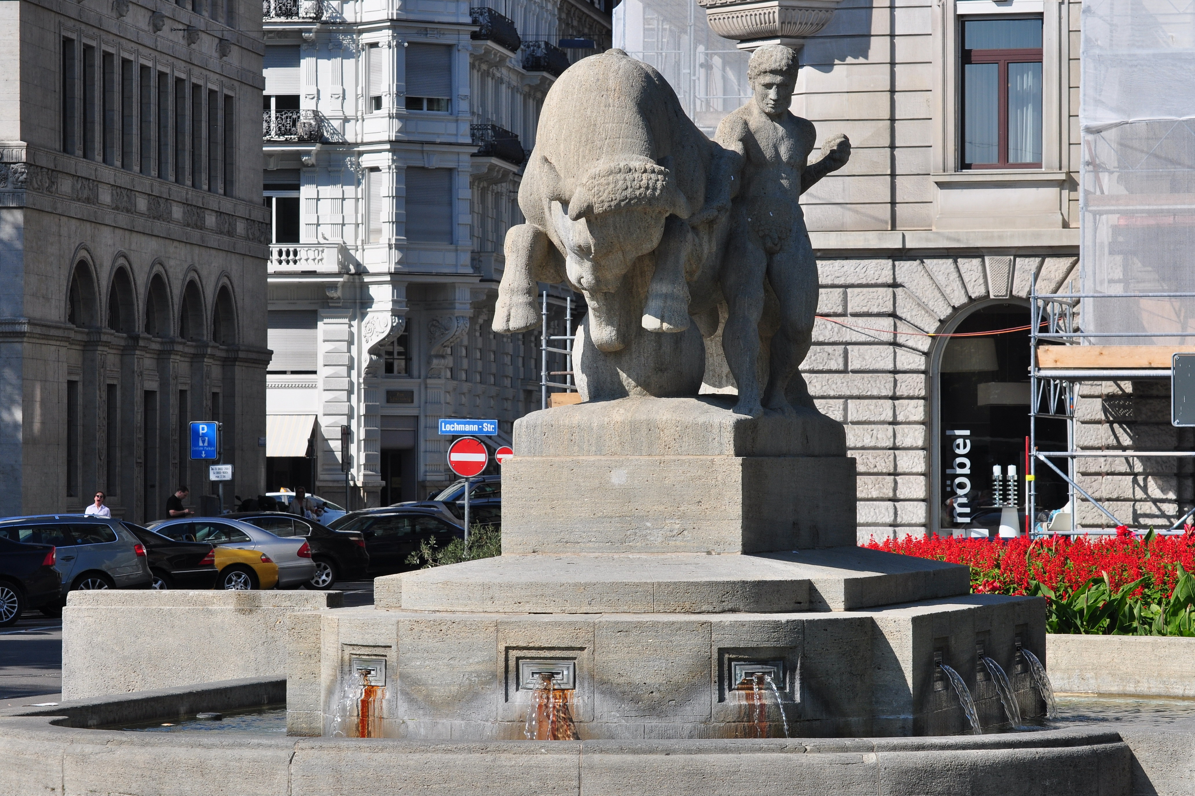 기념비적인 가이저 분수대(''Geiserbrunnen'')는 전직 도시 건축가인 아놀드 가이저/Arnold Geiserde(1844-1909)의 이름을 따서 지어졌다. 아놀드 가이저는 40,000 스위스 프랑의 유산으로 “도시를 아름답게 하는 기념비적인 분수대” 건립에 자금을 지원했다. 시 정부에서 개최한 미술 대회를 계기로 야콥 브륄만은 전쟁 기념관과 같은 황소떼 분수(가이저브루넨으로 더 잘 알려져 있음)를 조각했으며, 1911년 10월 20일에 개관했다.[10]