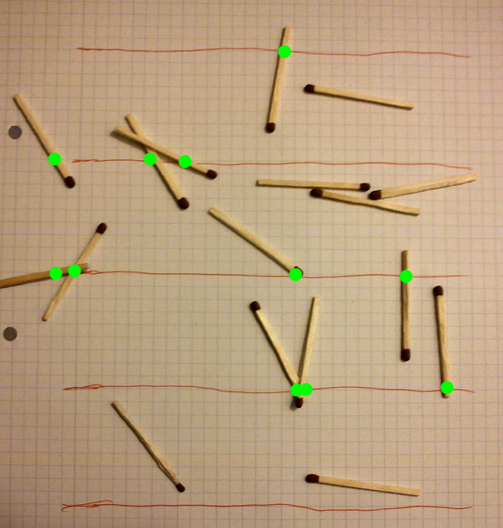 라차리니는 바늘의 길이가 나무 조각 너비의 5/6인 바늘을 선택했다. 이 경우 바늘이 선을 교차할 확률은 5/(3π)이다. 따라서 n개의 바늘을 떨어뜨리고 x개의 교차를 얻으면, π를 다음과 같이 추정한다.