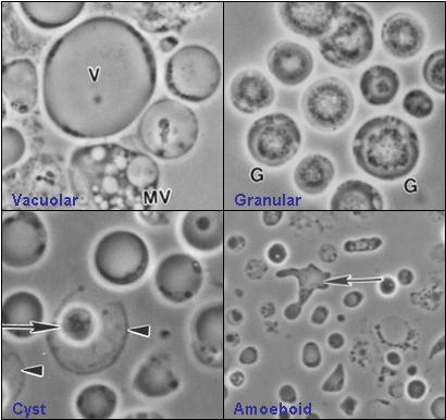 일반적으로 묘사되는 네 가지 형태는 '''공포''' (중앙체라고도 함), '''과립'''형, '''아메바'''형, 그리고 '''낭포'''형이다. 이 유기체의 외형은 산소에 극도로 민감하기 때문에 환경 조건에 크게 좌우된다. 이 모든 형태가 숙주 창자 내에 존재하는지는 불분명하다.
