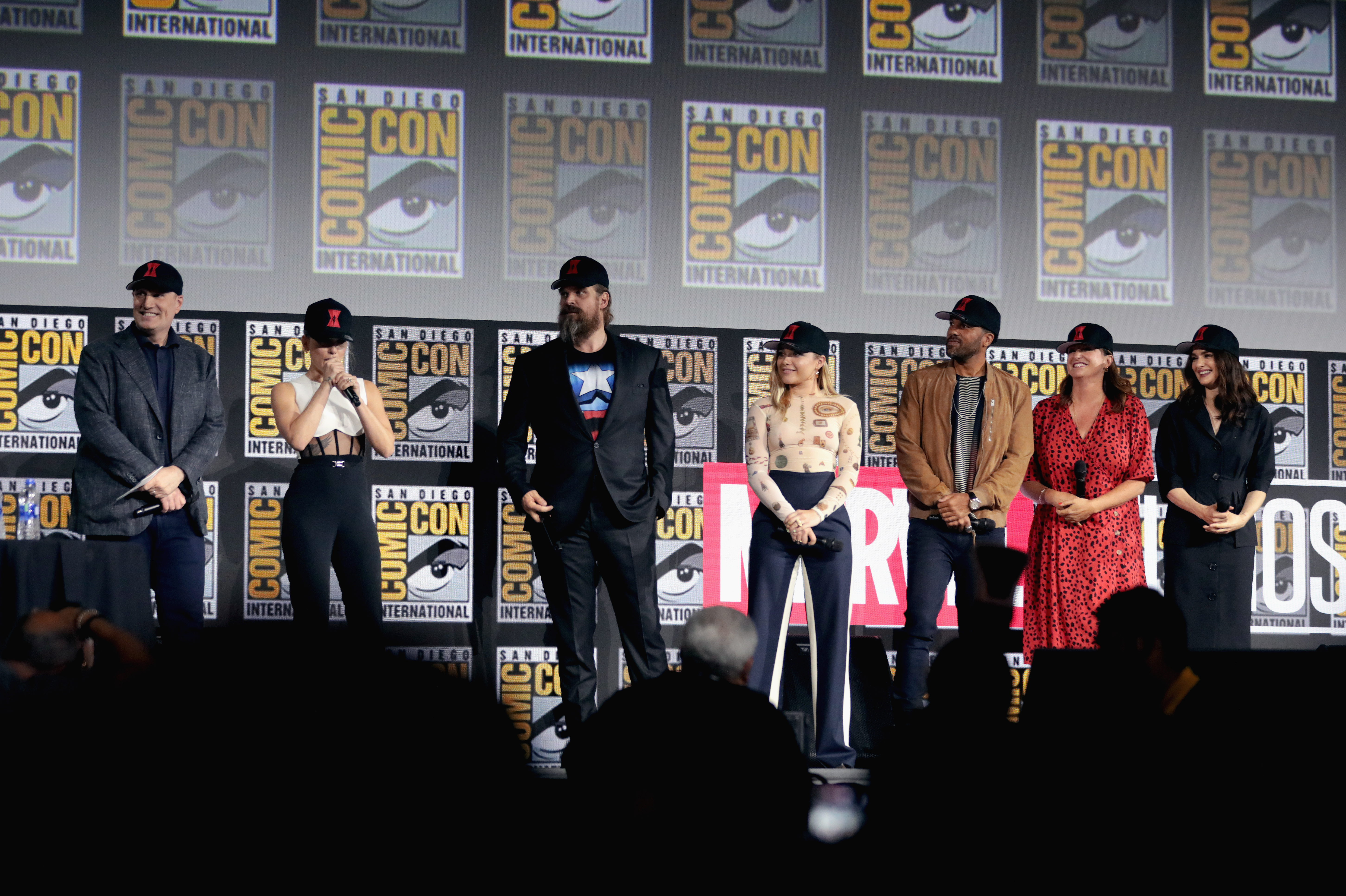 [[파일:Kevin_Feige,_Scarlett_Johansson,_David_Harbour,_Florence_Pugh,_O._T._Fagbenle,_Cate_Shortland_&_Rachel_Weisz_(48471879032).jpg|thumb|upright=1.21|왼쪽부터: 피기, 요한슨, 하버, 퓨, 파그벤레, 쇼트랜드, 와이즈는 2019년 샌디에이고 코믹콘에 참석했다.