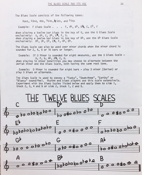 나인 노트 블루스 스케일은 밴워드와 세이커가 정의한 장음계의 반음계 변형으로, 플랫된 3도와 7도를 특징으로 한다(사실상 도리안 선법에서 대치된 음).[25] "정상적인 3도와 7도 음을 번갈아 사용하며 블루스 특유의 음정을 만들어낸다. 이러한 '블루 노트'는 아프리카 음계가 이 음악에 미친 영향을 나타낸다."[12]
