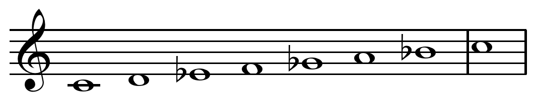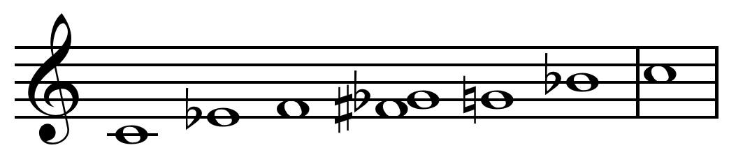 - 6음 블루스 스케일 (헥사토닉): 단음계 5음 음계에 5도 음을 추가한 것이다.