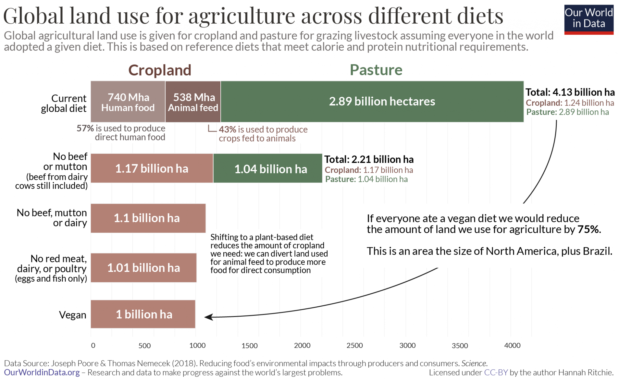 2018년 연구에 따르면 전 세계적으로 식물성 식단을 채택하면 농경지 사용량이 76%(아프리카 크기인 31억 헥타르) 감소하고 총 전 세계 온실 가스 배출량이 28% 감소할 것으로 나타났다. 이 배출량 감소의 절반은 메탄과 아산화 질소를 포함한 동물 생산으로 인한 배출을 피하면서 발생했고, 나머지 절반은 버려진 농지에서 다시 자라 공기에서 이산화탄소를 제거하는 나무에서 발생했다.[318][306] 저자들은 육류와 유제품을 피하는 것이 지구에 대한 영향을 줄이는 "가장 큰 방법"이라고 결론 내렸다.[319]