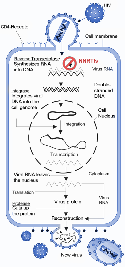 NNRTI는 RT 효소에 비경쟁적 억제 방식으로 결합하여 작용한다(그림 3).[35][36] 결합은 효소의 3차원 구조에 구조적 변화를 일으키고 NNIBP를 생성한다. HIV-1 RT에 NNRTI가 결합하면 아미노산 Tyr-181 및 Tyr-188 잔기에서 입체 이성질체의 형태 변화를 유도하여 p66 엄지 도메인을 과도하게 확장시킨다.[43] 이는 효소의 촉매 활성에 영향을 미치고 RT의 p66 서브 유닛의 중합 효소 활성 부위를 억제함으로써 HIV-1 복제를 차단한다.[44] 전체적인 구조적 변화는 핵산 주형의 효소를 추가적으로 불안정하게 하고 뉴클레오타이드에 결합하는 능력을 감소시킨다.[45] 바이러스의 RNA 전사가 억제되므로 바이러스의 복제 속도가 감소한다.[35]