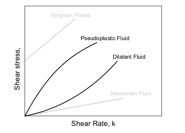여기서 τ는 전단 응력(접선 응력), τ는 항복 강도, η는 '''비뉴턴 점성''', ∂''u'' /∂''y''는 흐름의 속도 기울기(전단 속도), ''n''은 상수이다. 비뉴턴 유체의 성질은 위 식의 지수 ''n''에 따라 다음 3가지로 크게 분류된다.