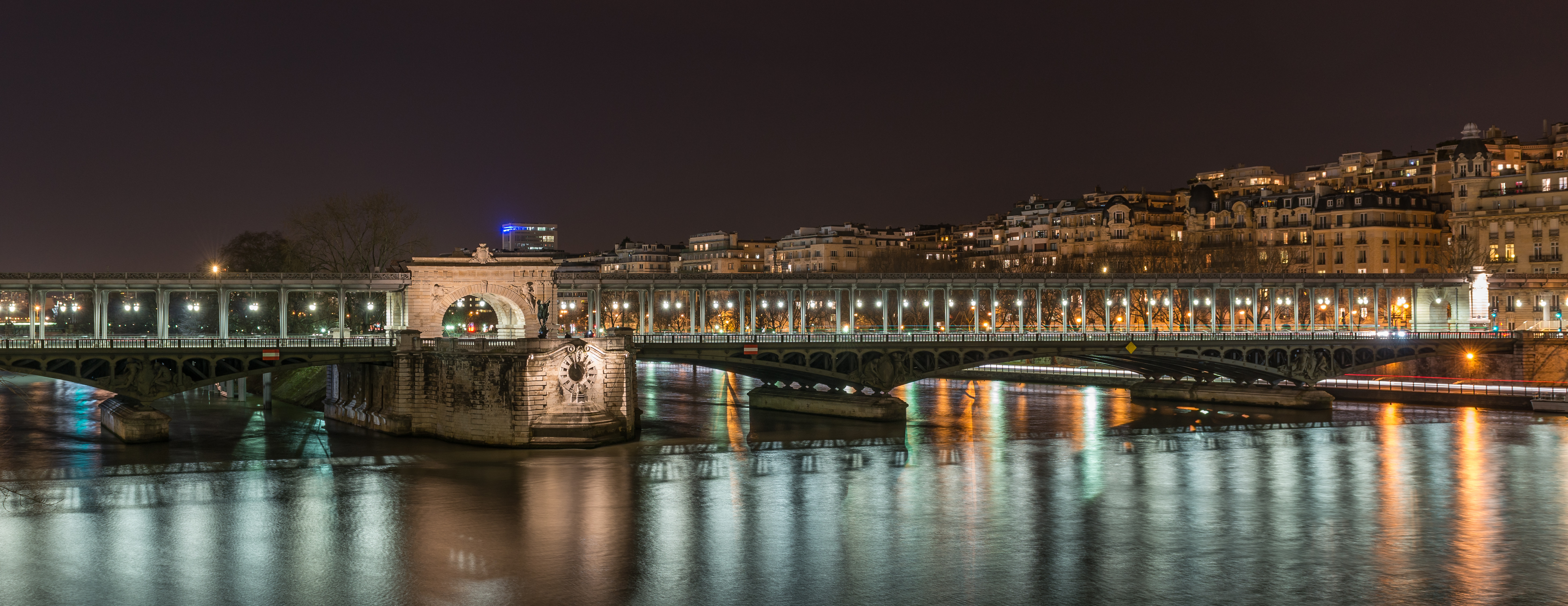 이 다리는 시뉴섬을 중심으로 두 개의 독립적인 구조물로 구성되어 있다. 2층 철도 고가교는 시뉴섬 위에 지어진 석조 아치 부분을 제외하고 금속 기둥으로 지탱된다. 시뉴섬 위 고가교 중앙 석조 아치에는 쥘 쿠탕의 《과학》과 《노동》, 장앙투안 앵잘베르의 《전기》와 《상업》 등 네 개의 석상이 부조되어 있다.[5]