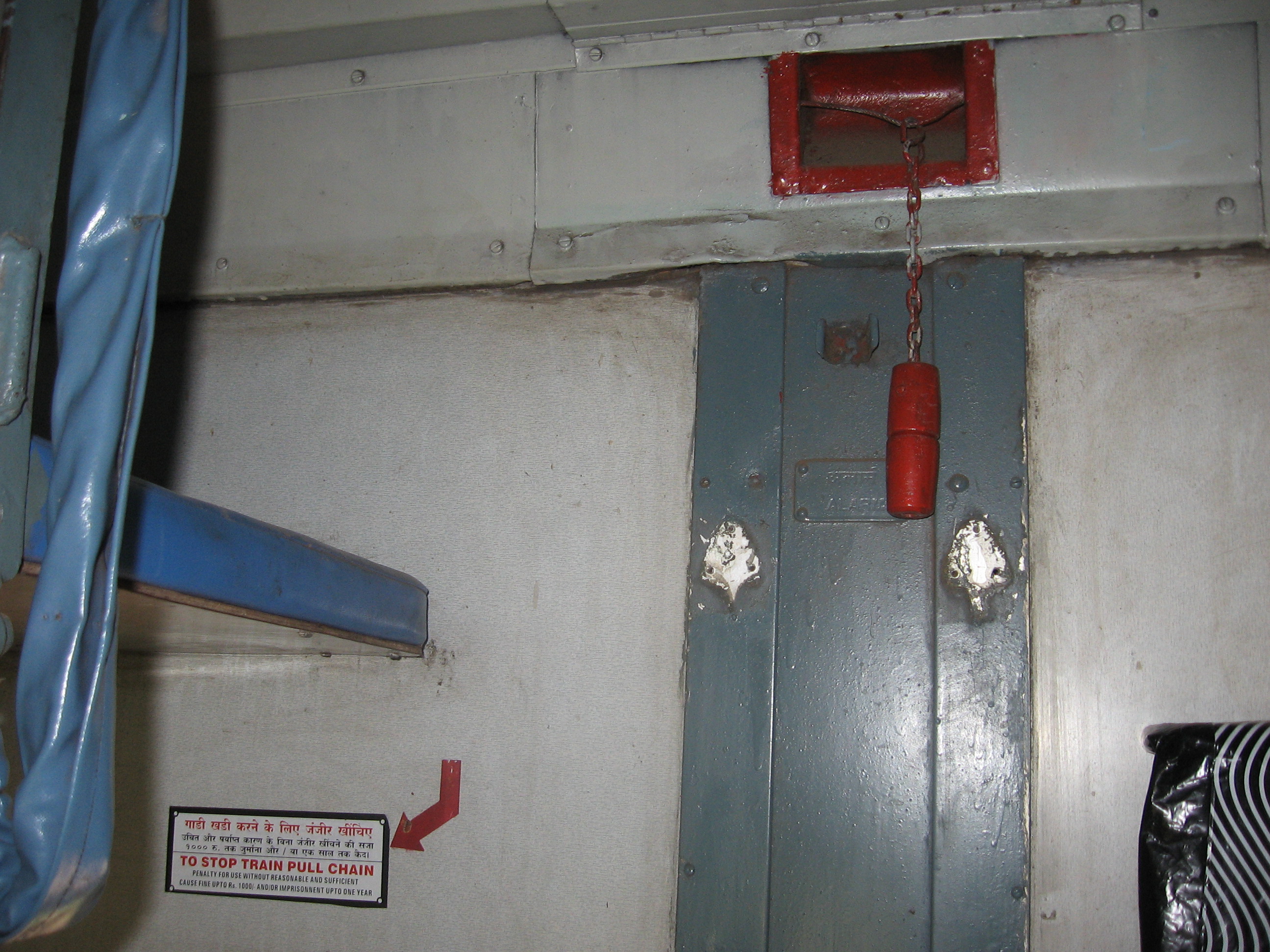 '체인 당기기'는 열차의 비상 제동 장치를 작동시켜 열차를 정지시키는 행위이다. 이는 실제 비상 상황에서 사용되기도 하지만, 인도 철도에서는 불법적으로 열차를 타거나 내리기 위해 사용되는 경우도 종종 있다.[13] 인도 철도에서 불법적인 체인 당기기는 심각한 문제로, 목적지 근처에서 계획되지 않은 정차를 하기 위해 체인을 당겨 열차를 지연시킨다. 이 시설을 오용하면 1000INR의 벌금 및/또는 1년 이하의 징역에 처해진다. 서비스 개선을 위해 전 인도 대통령 APJ 아브둘 칼람 박사는 비상 상황 시 승객이 열차의 차장 및 운전자와 소통하는 대체 방법을 제안했다.[14]