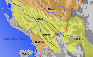 노란색 영역은 비오서 강과 주요 지류인 드리노 강의 유역을 나타내며, 빨간색 선은 알바니아와 그리스의 국경을 표시한다.