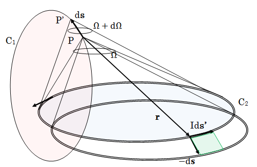 비오-사바르 법칙은 앙페르 법칙 과 밀접하게 관련되어 있다. [14] 비오-사바르 법칙을 적분하면 앙페르 법칙을 유도할 수 있다. 정자기장 상황에서 비오-사바르 법칙으로 계산된 자기장은 항상 가우스 자기 법칙과 앙페르 회로 법칙을 만족한다. [14]폐경로 C₁에서 경로 C₂를 조망하는 입체각을 Ω으로 한다. 입체각을 이용한 해석을 통해 비오-사바르 법칙으로부터 앙페르 법칙이 성립함을 보일 수 있다. [19] 폐회로 C₁상의 점 P에서 회로 C₂를 조망하는 입체각을 Ω이라 한다. 회로 C₁ 상을 점 P에서 미소 거리 d'''s'''만큼 이동한 점을 P′이라 하면, 점 P′에서 회로 C₂를 조망하는 입체각 Ω + dΩ는 −d'''s'''만큼 평행 이동된 회로를 조망하는 입체각과 같다. 회로상의 미소 길이 d'''s'''′과 평행 이동한 미소 거리 −d'''s'''에 의해 만들어지는 면의 면소 벡터 d'''S'''는 다음과 같다. :\mathrm{d}\boldsymbol{S} = \mathrm{d}\boldsymbol{s'} \times (-\mathrm{d}\boldsymbol{s}) = \mathrm{d}\boldsymbol{s} \times \mathrm{d}\boldsymbol{s'} 점 P에서 회로상의 미소 길이 d'''s'''′을 향하는 벡터를 '''r'''이라고 하면, 점 P에서 면소 d'''S'''를 보는 입체각은 다음과 같다. :\frac{\mathrm{d}\boldsymbol{S} \cdot \boldsymbol{r}}{r^3} = \frac{(\mathrm{d}\boldsymbol{s} \times \mathrm{d}\boldsymbol{s'}) \cdot \boldsymbol{r}}{r^3} = \frac{(\mathrm{d}\boldsymbol{s'} \times \boldsymbol{r})}{r^3} \cdot \mathrm{d}\boldsymbol{s} 이것을 d'''s'''′에 대해 회로 일주분 선적분 하면 입체각의 변화 dΩ를 얻을 수 있다. :\mathrm{d}\Omega\ = \left(\oint_{C_2} \frac{\mathrm{d}\boldsymbol{s'} \times \boldsymbol{r}}{r^3}\right) \cdot \mathrm{d}\boldsymbol{s} 회로상의 미소 전류 요소가 점 P에 만드는 자기장은 비오-사바르 법칙을 적분하여 다음과 같이 얻을 수 있다. :\boldsymbol{H} = \oint_{C_2} \frac{1}{4\pi} \frac{I\mathrm{d}\boldsymbol{s'} \times (-\boldsymbol{r})}{r^3} 이 양변에 d'''s'''를 내적하여 앞의 식을 대입하면 다음 관계가 얻어진다. :\boldsymbol{H} \cdot \mathrm{d}\boldsymbol{s} = -\frac{I}{4\pi} \mathrm{d}\Omega 점 P가 폐곡선 C₁상을 일주하는 Ω의 변화는 다음과 같다. : \oint_{C_1} \mathrm{d}\Omega = -4\pi 따라서, :\oint_{C_1} \boldsymbol{H} \cdot \mathrm{d}\boldsymbol{s} = I 로 앙페르 법칙 그 자체가 유도된다. C₁으로 둘러싸인 영역 D(그림의 적색 영역)의 면적을 S₁이라고 하면, 면 S₁에 대한 전류 면밀도의 크기 j는 다음과 같다. :j = \frac{I}{S_1} 예를 들어 폐곡선 C₁이 1주하는 동안 회로 C₂가 3주하는 경우에는 전류 면밀도의 크기는 3j, 폐곡선 C₁이 2주하는 동안 회로 C₂가 1주하는 경우에는 전류 면밀도의 크기는 j/2이다. 이것을 고려하면, 다음과 같이 쓸 수 있다. :\oint_{C_1} \boldsymbol{H} \cdot \mathrm{d}\boldsymbol{s} = \int_{D} \boldsymbol{j} \cdot \mathrm{d}\boldsymbol{S_1} 비오-사바르 법칙의 양변의 회전을 취하면 다음과 같다. :\operatorname{rot} \boldsymbol{H} = \frac{1}{4 \pi} \int_V \operatorname{rot} \left(\boldsymbol{j} \times \frac{\boldsymbol{r}}{r^3}\right) \mathrm{d}^3 \boldsymbol{r}' 벡터 해석의 항등식에 의해 다음이 성립한다. :\operatorname{rot} \left(\boldsymbol{j} \times \frac{\boldsymbol{r}}{r^3}\right) = \left(\operatorname{div} \frac{\boldsymbol{r}}{r^3}\right) \boldsymbol{j} - (\operatorname{div} \boldsymbol{j}) \frac{\boldsymbol{r}}{r^3} 또한, 다음이 성립한다. :\operatorname{div} \frac{\boldsymbol{r}}{r^3}= 4\pi \delta (r) 따라서, 다음을 얻는다. :\begin{align}\operatorname{rot} \boldsymbol{H} &= \frac{1}{4 \pi} \int_V 4\pi \delta (r) \cdot \boldsymbol{j} \mathrm{d}^3 \boldsymbol{r}'\\ &= \boldsymbol{j}\end{align} 이것은 앙페르 법칙 그 자체이다. 단, 이 변환은 정자기장에서만 유효하다.