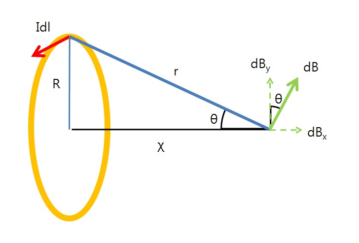 Biot–Savart law영어 은 도선에 의해 생성되는 3차원 공간에서 위치 '''r'''에서의 자기 선속 밀도 '''B'''를 계산하는 데 사용된다. [6] 정상 전류는 시간에 따라 변하지 않고 전하가 어떤 지점에서도 축적되거나 고갈되지 않는 전하의 끊임없는 흐름이다. 이 법칙은 전류가 흐르는 경로 ''C''(예: 전선)에 대해 평가되는 선적분 의 물리적 예이다. SI 단위 테슬라(T) 의 방정식은 다음과 같다. [4] : \mathbf{B}(\mathbf{r}) = \frac{\mu_0}{4\pi} \int_C \frac{I \, d\boldsymbol \ell\times\mathbf{r'}}{|\mathbf{r'}|^3} 여기서 d\boldsymbol \ell 는 경로 C 를 따라 방향이 ''직류 '' 방향이고 크기가 전선의 미소 요소 길이인 벡터이고, \boldsymbol \ell 는 경로 C 의 한 점이며, \mathbf{r'} = \mathbf{r} - \boldsymbol \ell 는 전선 요소(d\boldsymbol \ell )의 점 \boldsymbol \ell 에서 자기장을 계산하는 점(\mathbf{r} )까지의 전체 변위 벡터이다. 그리고 ''μ''0 는 자기 상수이다. 또는 다음과 같이 나타낼 수도 있다. : \mathbf{B}(\mathbf{r}) = \frac{\mu_0}{4\pi}\int_C \frac{I \, d\boldsymbol \ell\times\mathbf{\hat r'}}{|\mathbf{r'}|^2} 여기서 \mathbf{\hat r'} 는 \mathbf{r'} 의 단위 벡터이다. 굵은 글꼴의 기호는 벡터량을 나타낸다. 이 적분은 일반적으로 폐곡선을 따라 이루어진다. 정상 전류는 경계가 있을 때만 폐회로를 따라 흐를 수 있기 때문이다. 하지만 이 법칙은 무한히 긴 전선에도 적용된다. 이 방정식을 적용하려면 자기장을 계산할 공간의 점을 임의로 선택한다(\mathbf r ). 그 점을 고정한 상태로 전류 경로에 대한 선적분을 계산하여 해당 점에서의 총 자기장을 구한다. 이 법칙의 적용은 자기장에 대한 중첩 원리 , 즉 자기장이 전선의 각 미소 구간이 개별적으로 생성하는 자기장의 벡터 합이라는 사실에 암묵적으로 의존한다. [5] 예를 들어, 반지름 R 이고 전류 I 가 흐르는 고리의 자기장을 생각해 보자. 고리의 중심선을 따라 x 만큼 떨어진 점에서 자기장 벡터는 다음과 같다. :\mathbf B = {\mu_0IR^2\over 2(x^2+R^2)^{3/2}}\hat\mathbf x, 여기서 \hat{\mathbf x} 는 고리의 중심선을 따라 향하는 단위 벡터이고(고리는 원점에 중심이 있는 것으로 간주한다). [6] 위에서 설명한 것과 같은 고리는 헬름홀츠 코일 , 솔레노이드 , Magsail 우주선 추진 시스템과 같은 장치에 사용된다. 중심선을 벗어난 지점에서의 자기장 계산에는 타원 적분 이 포함된 보다 복잡한 수학이 필요하며, 이는 수치 해법이나 근사를 필요로 한다. [7] 전류가 무한히 가는 선을 따라 흐른다고 근사할 수 있을 때 위 공식이 잘 작동한다. 도체에 두께가 있는 경우, Biot–Savart law영어 의 적절한 공식(SI 단위계)은 다음과 같다. : \mathbf B (\mathbf r) = \frac{\mu_0}{4\pi}\iiint_V\ \frac{(\mathbf{J}\,dV)\times\mathbf r'}{|\mathbf r'|^3} 여기서 \mathbf{r'} 은 dV에서 관측점 \mathbf{r} 로 향하는 벡터이고, dV 는 체적 요소이며, \mathbf{J} 는 그 체적 내의 전류 밀도 벡터이다(SI 단위계에서 A/m2 ). 단위 벡터 \mathbf{\hat r'} 로 표현하면 다음과 같다. : \mathbf B (\mathbf r) = \frac{\mu_0}{4\pi}\iiint_V\ dV \frac{\mathbf J\times\mathbf{\hat r'}}{|\mathbf r'|^2} 일정한 전류 ''I''의 특수한 경우 자기장 \mathbf{B} 는 다음과 같다. : \mathbf{B}(\mathbf{r}) = \frac{\mu_0}{4\pi} I \int_C \frac{d\boldsymbol \ell \times \mathbf{r'}}