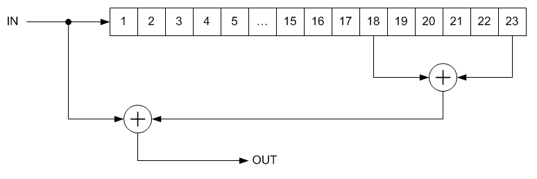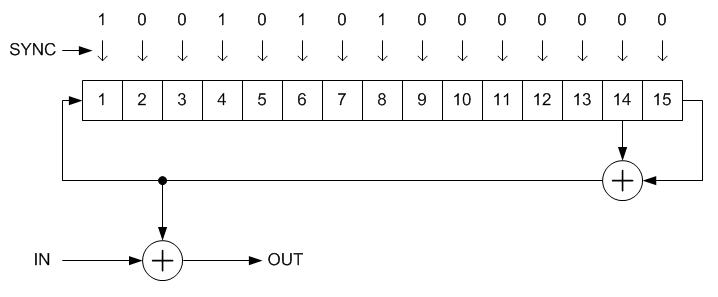 - '''가산 스크램블러'''는 프레임 동기화에 의해 재설정되어야 한다. 만약 이 과정이 실패하면, 전체 프레임을 디스크램블할 수 없으므로 대규모 오류 전파가 발생한다. (또는 무엇을 보냈는지 알고 있다면 스크램블러를 동기화할 수 있다.)