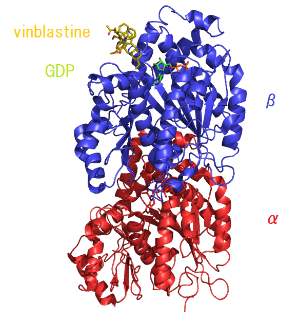 빈카 알칼로이드 계열의 항암제인 빈블라스틴은 튜불린 중합을 억제하여 미세소관 형성을 방해하고, 세포 분열을 중기(M기)에서 멈추게 한다.[28][13][14] 낮은 농도에서는 미세소관 역학을 억제하고, 높은 농도에서는 미세소관을 파괴한다.[16] P-당단백질과 결합하여 뇌 흡수가 제한적이어서, 말초 신경계에 선택적으로 작용한다.[19][20]
