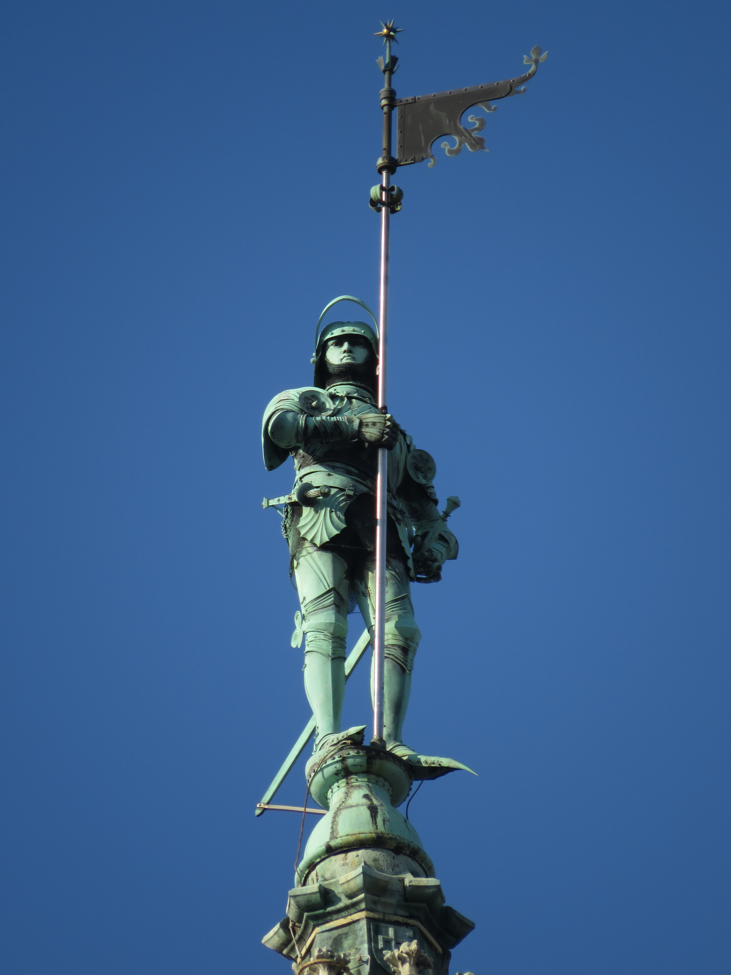 98미터 높이의 첨탑 꼭대기에는 3.4미터 높이의 철제 기수 "시청의 남자"가 서 있다. 이 조각상은 알렉산더 네어가 디자인했으며, 금속 세공 장인이자 공장주인 루드비히 빌헬름이 기증했다.