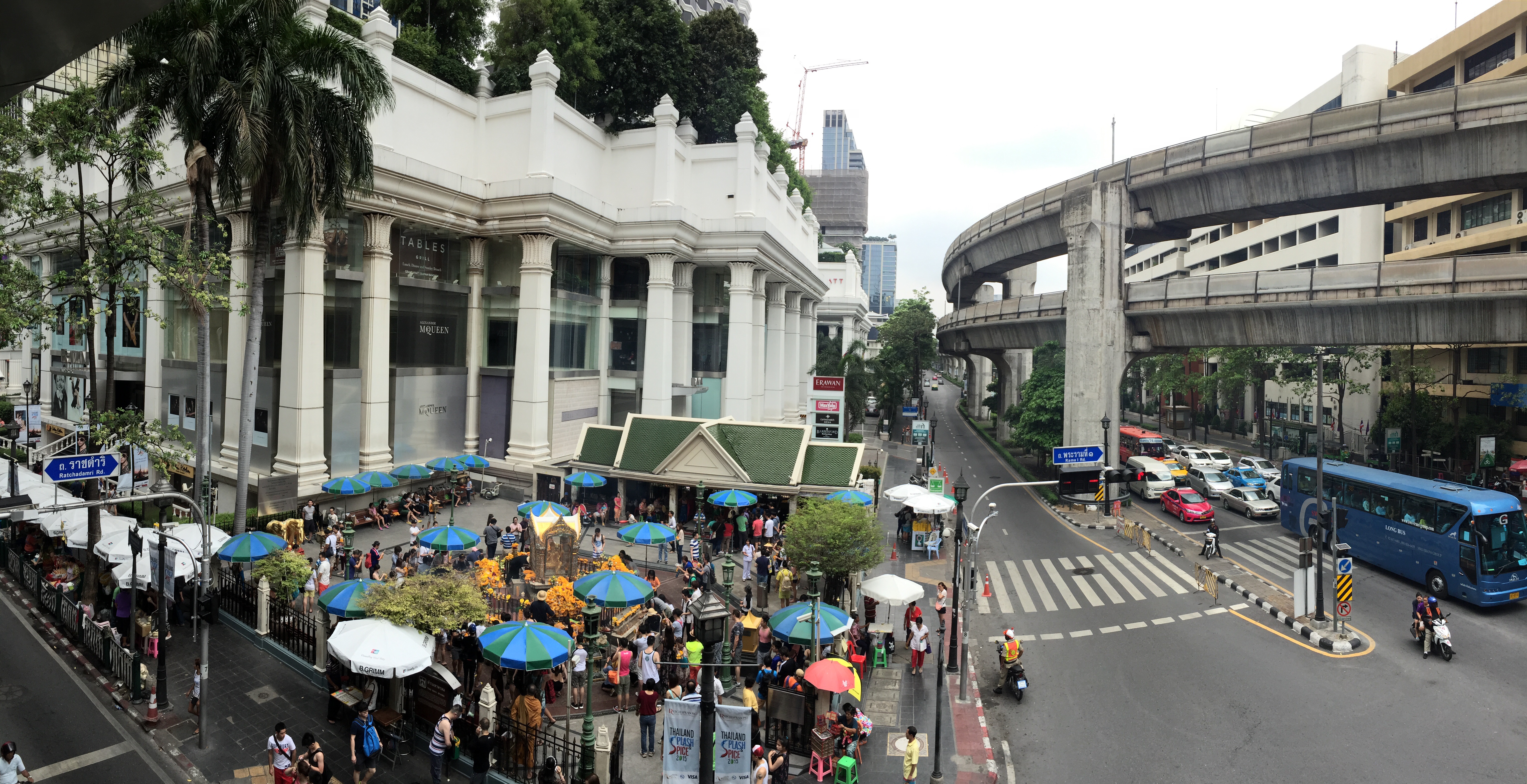 에라완 사당은 랏차프라송의 한 모퉁이에 서 있으며, 그랜드 하얏트 에라완 호텔(1991년에 에라완을 대체) 앞에 있다. 이곳은 현지인과 관광객이 소원을 빌러 오는 유명한 예배 장소이지만, 2015년 방콕 최악의 테러 공격이 발생한 곳이기도 하다.