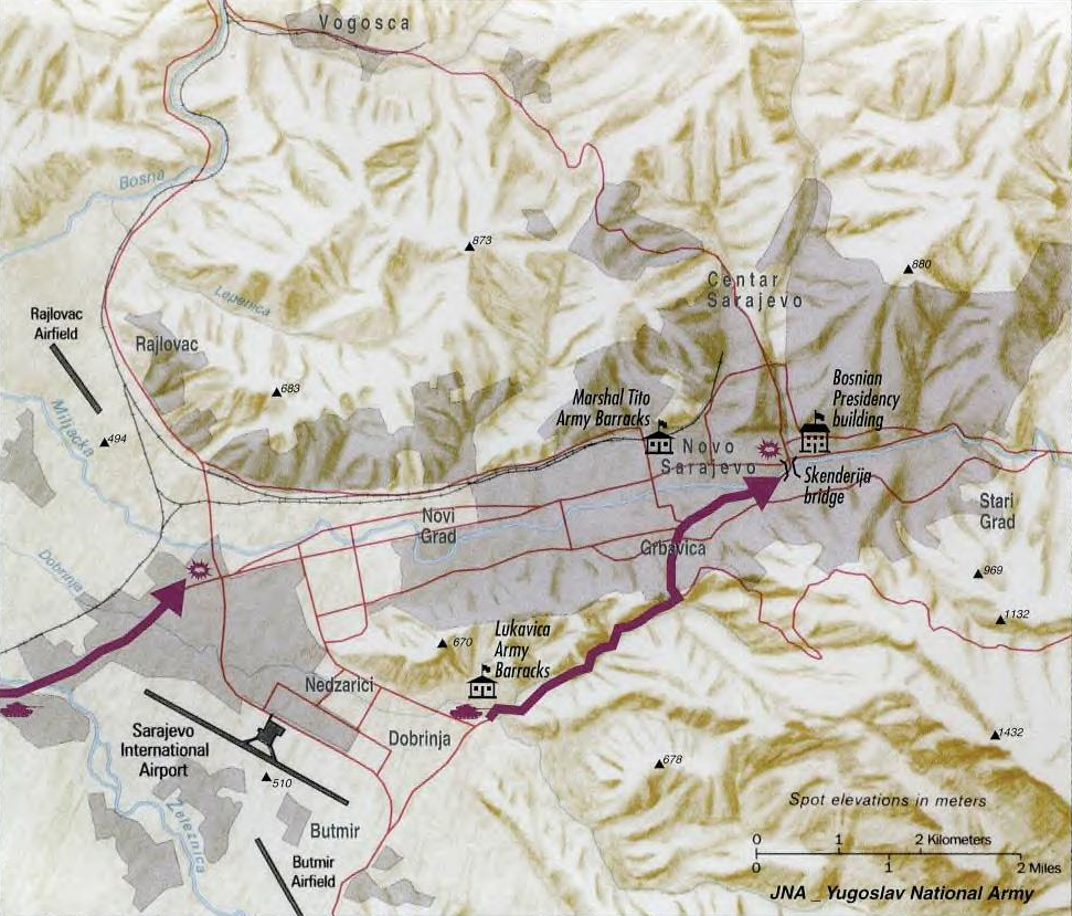 분쟁 초기 몇 달 동안, 유고슬라비아 인민군 부대는 사라예보를 에워싼 구릉지대에 배치되었다. 포병 및 기타 장비가 이때 반입되었고, 이후 포위 공격에서 중요한 역할을 하게 된다. 1992년 2월, 보스니아 헤르체고비나 정부는 유고슬라비아 정부에 이들 군대의 배치를 중단할 것을 요구했다. 슬로보단 밀로셰비치는 보스니아 헤르체고비나 국경 밖에 있는 유고슬라비아 인민군 일부의 철수에 동의했으나, 이들 중 세르비아인 병사들은 보스니아 세르비아군이 되어 보스니아 헤르체고비나에 남았다.