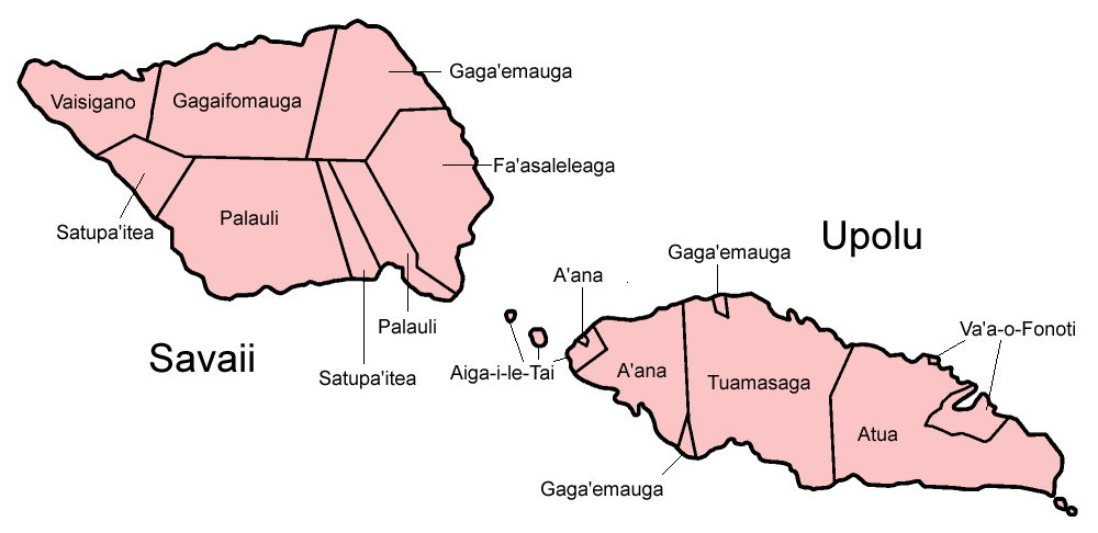 사모아에는 11개의 정치 구역(이투말로)이 있으며, 그 중 6개는 사바이섬에 있다: 파아사레레아가, 가가에마우가, 가가이포마우가, 팔라울리, 사투파이테아 및 바이사가노.