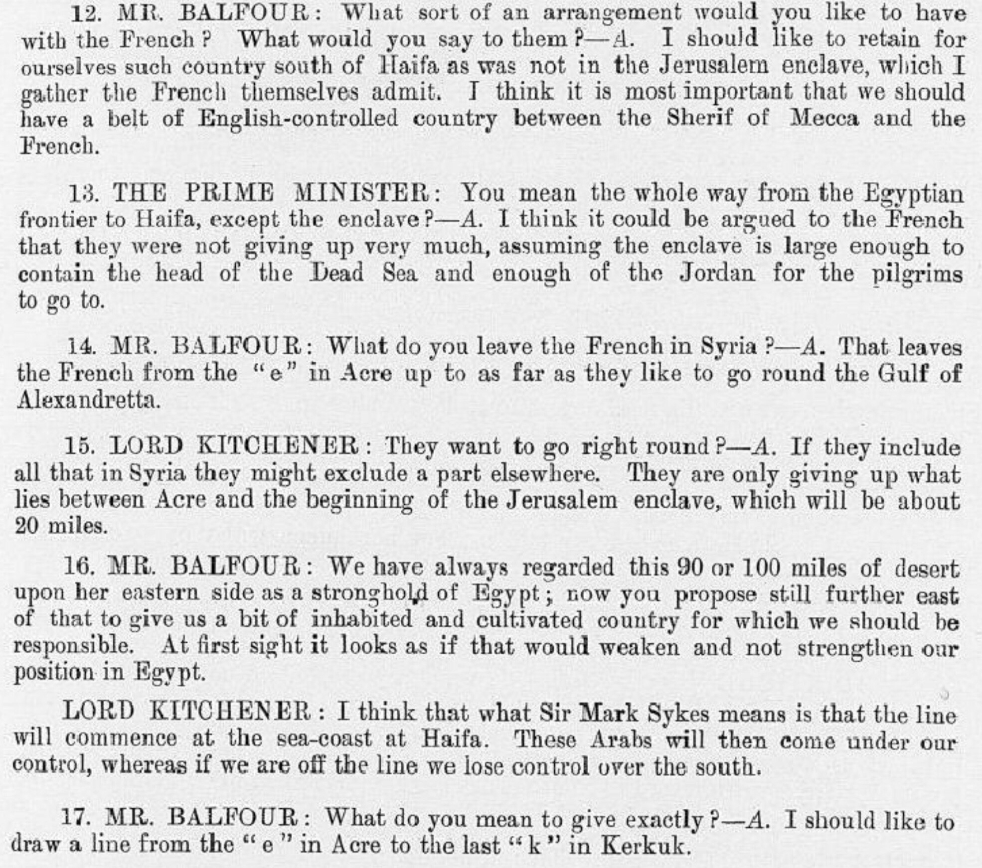 12월 16일, 마크 사이크스는 영국 전쟁 위원회와의 인터뷰에서 협상 목표를 제시했다. 그는 팔레스타인 ("하이파 남쪽의 그러한 국가")에 대한 영국의 통제를 원하며 "아크레의 'e'에서 키르쿠크의 마지막 'k'까지의 선" 남쪽에 "영국이 통제하는 지역"을 만들고자 한다고 말했다.