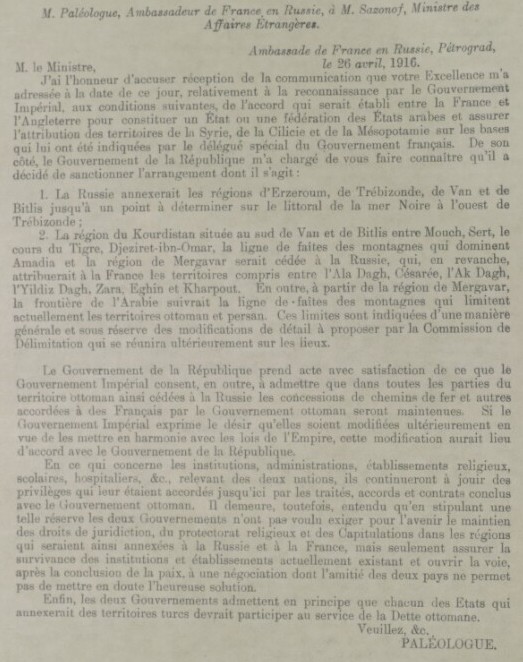 러시아 제국은 1916년 4월 26일에 사이크스-피코 협정의 조건에 동의했다. 최종 조건은 1916년 5월 9일, 런던 주재 프랑스 대사 폴 캄봉이 영국 외무부 장관 에드워드 그레이에게 보낸 서신에 담겼으며, 그레이가 1916년 5월 16일에 보낸 회신으로 비준되었다.[22][23]영국, 프랑스, 러시아 간의 공식적인 협정은 아래의 11개 서신으로 구성되었다.