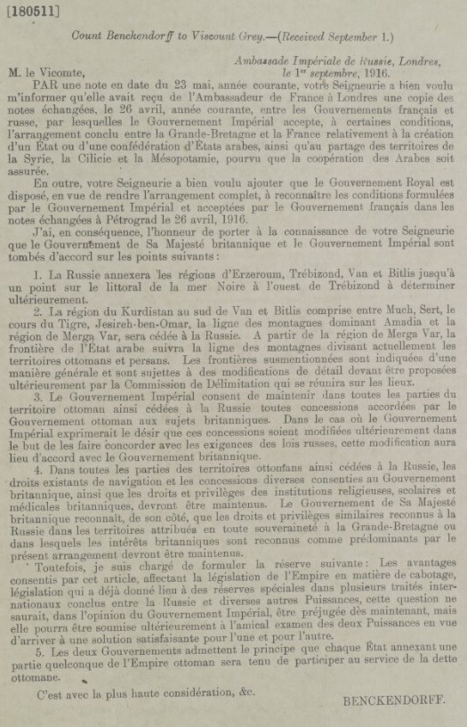 1916년 9월 1일 | 알렉산데르 폰 벤켄도르프, 런던 주재 러시아 대사 | 그레이 | 사조노프-팔레올로그 협정과 사이크스-피코 협정에 대한 러시아와 영국의 동의 확인 | ![]() |