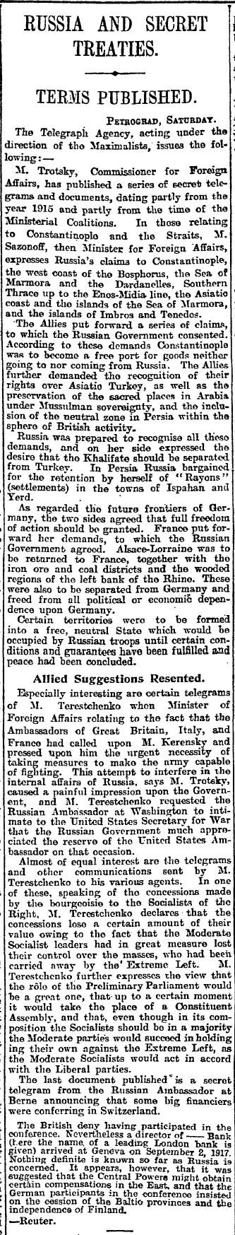 1917년 러시아 혁명 이후 레닌이 이끄는 볼셰비키 정권은 제정 러시아의 비밀 외교 문서를 폭로하는 과정에서 사이크스–피코 협정의 내용을 공개했다. 1917년 11월 23일 ''이즈베스티야(Izvestia)''와 ''프라우다(Pravda)''에 협정 전문이 실렸고, 이어 11월 26일에는 영국 ''더 맨체스터 가디언(The Manchester Guardian)''에도 보도되었다.[42]