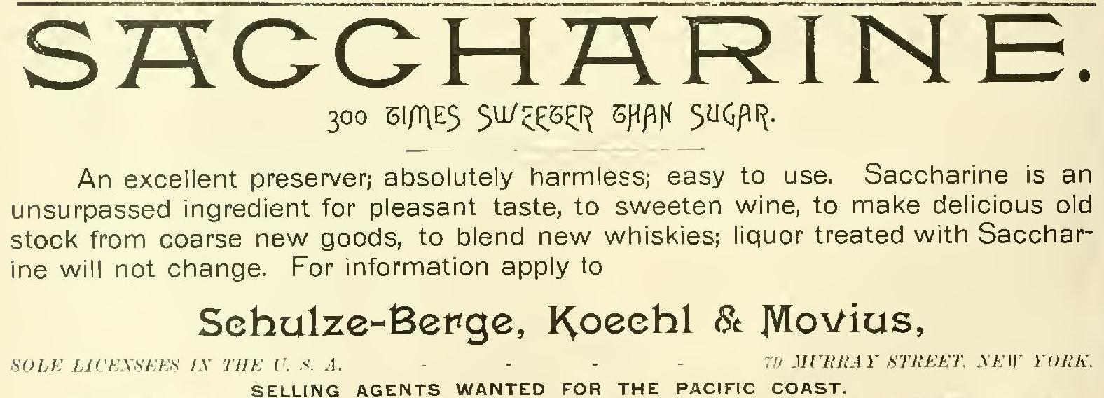 사카린은 1879년 존스 홉킨스 대학교의 이라 렘젠 실험실에서 콜타르 유도체를 연구하던 화학자 콘스탄틴 파흘베르크에 의해 처음 생산되었다.[20] 파흘베르크는 어느 저녁 손에서 단맛을 느꼈고, 이를 그날 연구하던 벤조산 술피미드 화합물과 연결시켰다.[21][22] 1879년과 1880년에 파흘베르크와 렘젠은 벤조산 술피미드에 관한 논문을 발표했다.[3][23]1884년, 뉴욕시에서 독자적으로 연구하던 파흘베르크는 사카린이라는 이름을 붙이고 이 물질의 생산 방법을 설명하며 여러 국가에 특허를 신청했다.[24] 2년 후, 그는 독일 마그데부르크 교외에 있는 공장에서 이 물질을 생산하기 시작하여 곧 부자가 되었다. 그러나 렘젠은 자신의 실험실에서 생산된 물질에 대한 공로를 인정받아야 한다고 믿으며 분노했다. 렘젠은 "파흘베르크는 악당이다. 그와 같은 숨결로 내 이름이 언급되는 것을 듣는 것은 역겹다."라고 말했다.[25]