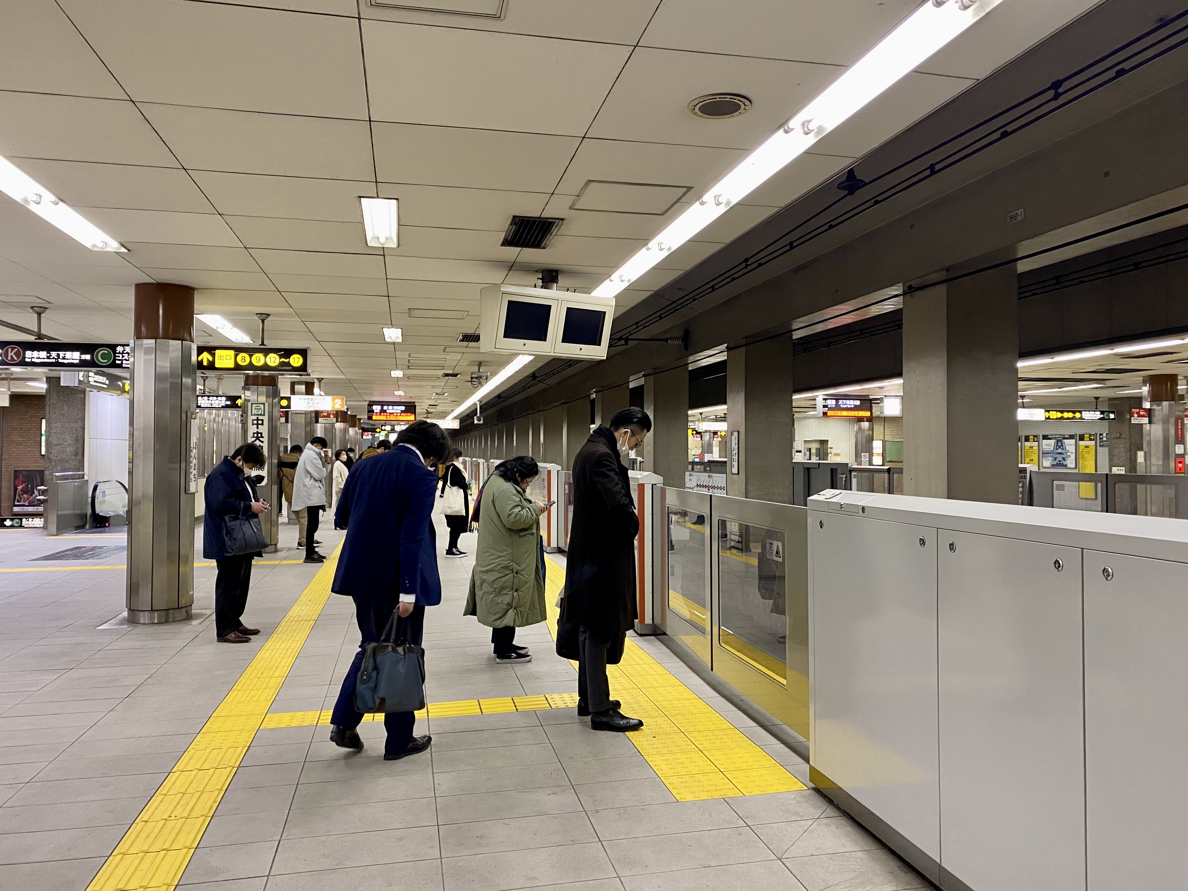 주오선 승강장은 섬식 승강장 1면 2선 구조를 갖추고 있으며, 주오 대로를 따라 위치한 센바 센터 빌딩의 지하층에 자리 잡고 있다.섬식 승강장이지만 1번선과 2번선 승강장 사이가 다소 떨어져 있는 것이 특징이다. 이는 미도스지 선의 우메다역과 유사한 구조이며, 이 간격은 인접한 혼마치역까지 이어진다. 이러한 구조 때문에 다니마치욘초메역 방향 승강장에서는 상하행선 간 이동이 비교적 쉽지만, 혼마치역 방향 승강장에서는 계단을 이용해야 한다.