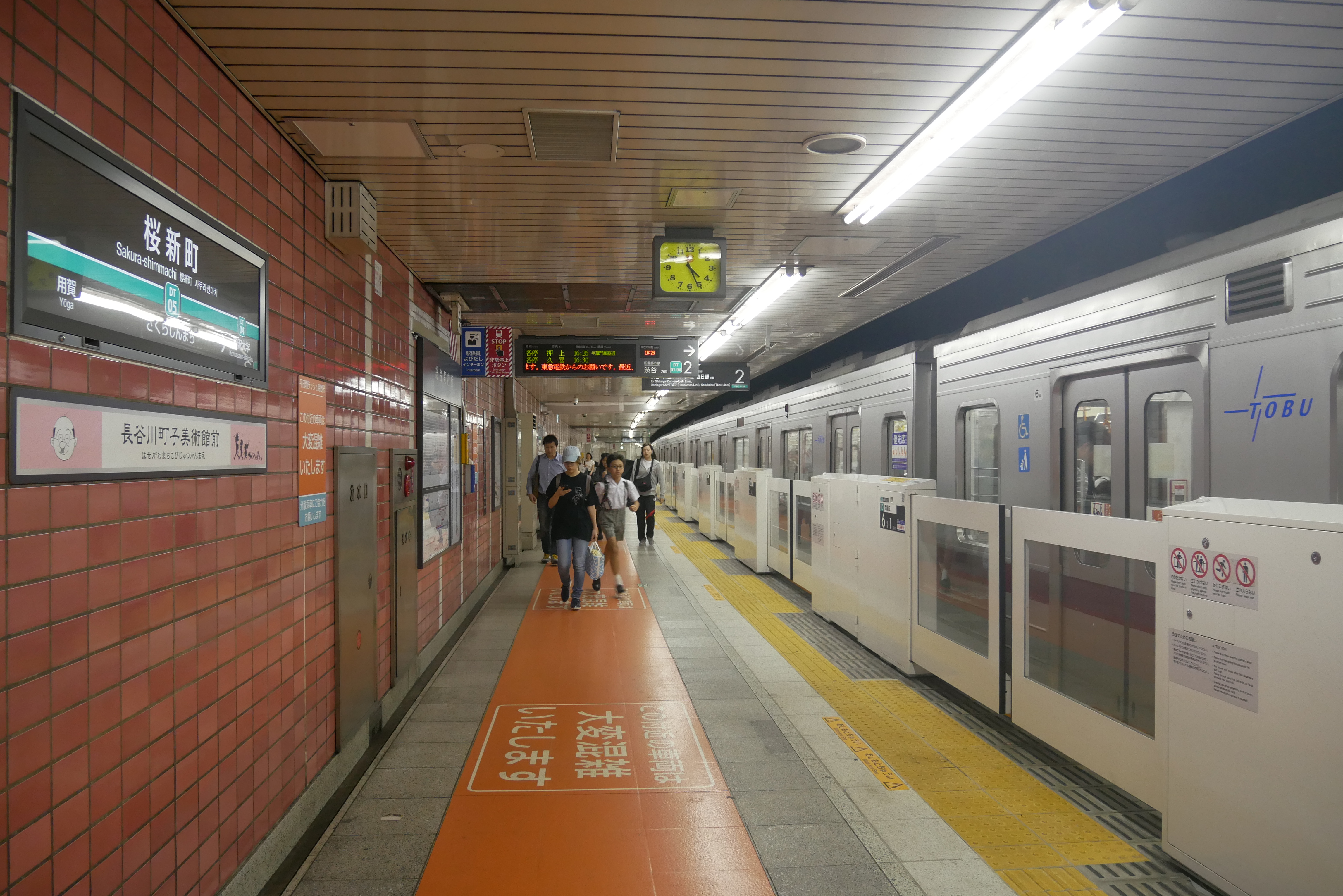 지하 2층과 지하 3층에 각각 1면 1선의 단선 승강장과 1선의 통과선이 있는 2층 구조의 지하역이다. 지하 2층은 하행, 지하 3층은 상행 승강장으로 이용되고 있다. 통과선은 승강장에서는 보이지만 벽면 반대편에 있는 승강장에서는 보이지 않는다. 단, 플랫폼 양단에서 통과선과의 분기점을 볼 수 있기 때문에 벽면 쪽으로 통과선을 달리는 통과 열차의 모습을 확인할 수 있다.역명을 딴 역 색상은 "벚꽃색"이다. 단, 실제로 사용되는 색은 일본 산업 규격(JIS규격)이 정한 JIS관용색에서 분홍색보다 조금 더 진한 ■빨간색에 가깝다. 2006년을 전후로 벽면 개량 공사를 통해 벽면에 벚꽃 장식이 이루어졌다. 또한 역 주변 도로에는 벚꽃 나무가 가로수로 심어져 있다.