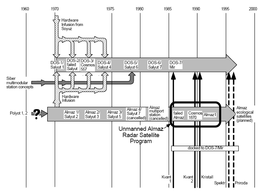 * 큰 수평 화살표는 소련의 두 우주 정거장 프로그램인 DOS(상단)와 Almaz-OPS(하단)의 진화 과정을 나타낸다.