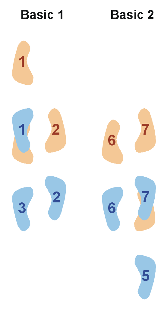 이 춤의 두 가지 필수 요소는 앞뒤 기본 스텝과 크로스 바디 리드이다. 이 패턴에서 리더는 1에 앞으로 스텝을 밟고, 90도 시계 반대 방향으로 돌면서 (왼쪽을 향하면서) 2-3에 오른쪽으로 스텝을 밟아 슬롯을 연다. 그런 다음 팔로워는 5-6에 똑바로 앞으로 스텝을 밟고 7-8에 턴을 하는 동안, 리더는 시계 반대 방향으로 90도 돌면서 약간 앞으로 이동하여 슬롯으로 돌아간다. 총 180° 회전하면서 팔로워와 리더가 위치를 바꾼다.