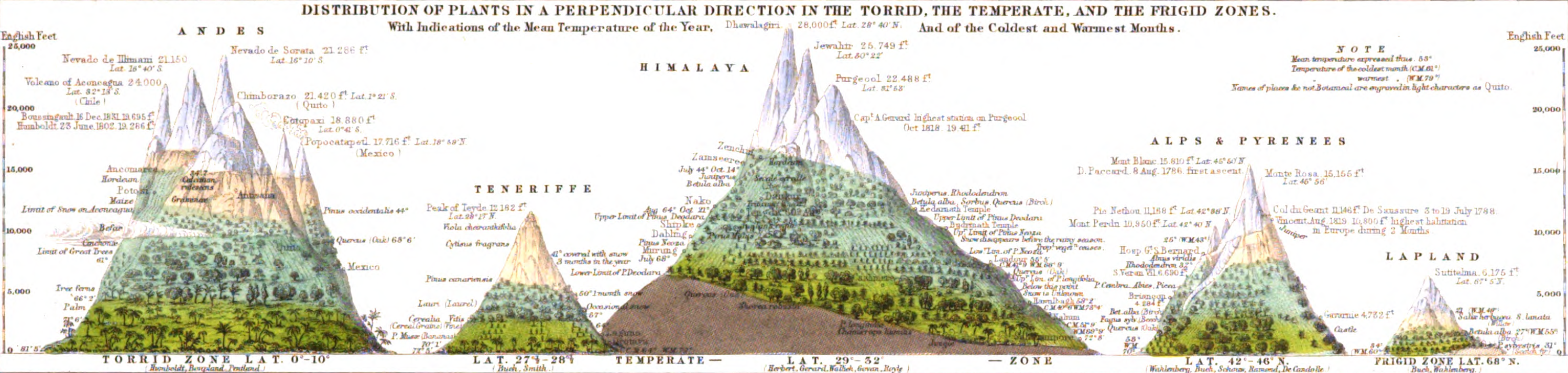 저지대에 접한 급경사의 고산 지형이 있으면, 저지대에서 산정까지 이르는 식생 변화를 명확하게 관찰할 수 있으므로, 고도에 따른 수직적인 수목한계선, 즉 '''아고산대'''에서 고산대로 바뀌는 선을 가리키는 경우가 많다.