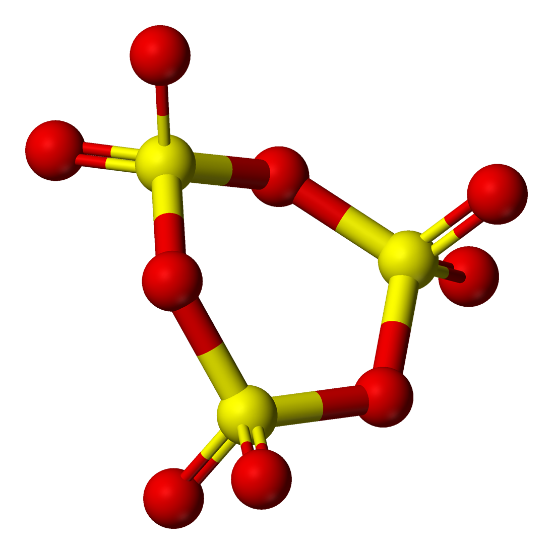 액체 및 기체 SO₃영어는 단량체와 고리형 삼량체 사이의 평형 상태에 존재한다.[8] 고체 SO₃의 성질은 복잡하며, 적어도 3가지의 다형체가 알려져 있으며, 이들 사이의 전환은 미량의 물에 의존한다.[9]순수한 SO₃는 16.8 °C에서 고체가 되어 γ-SO₃ 형태를 이루는데, 이는 고리형 삼량체 구조 [S(=O)₂(μ-O)]₃를 채택한다.[10][1]