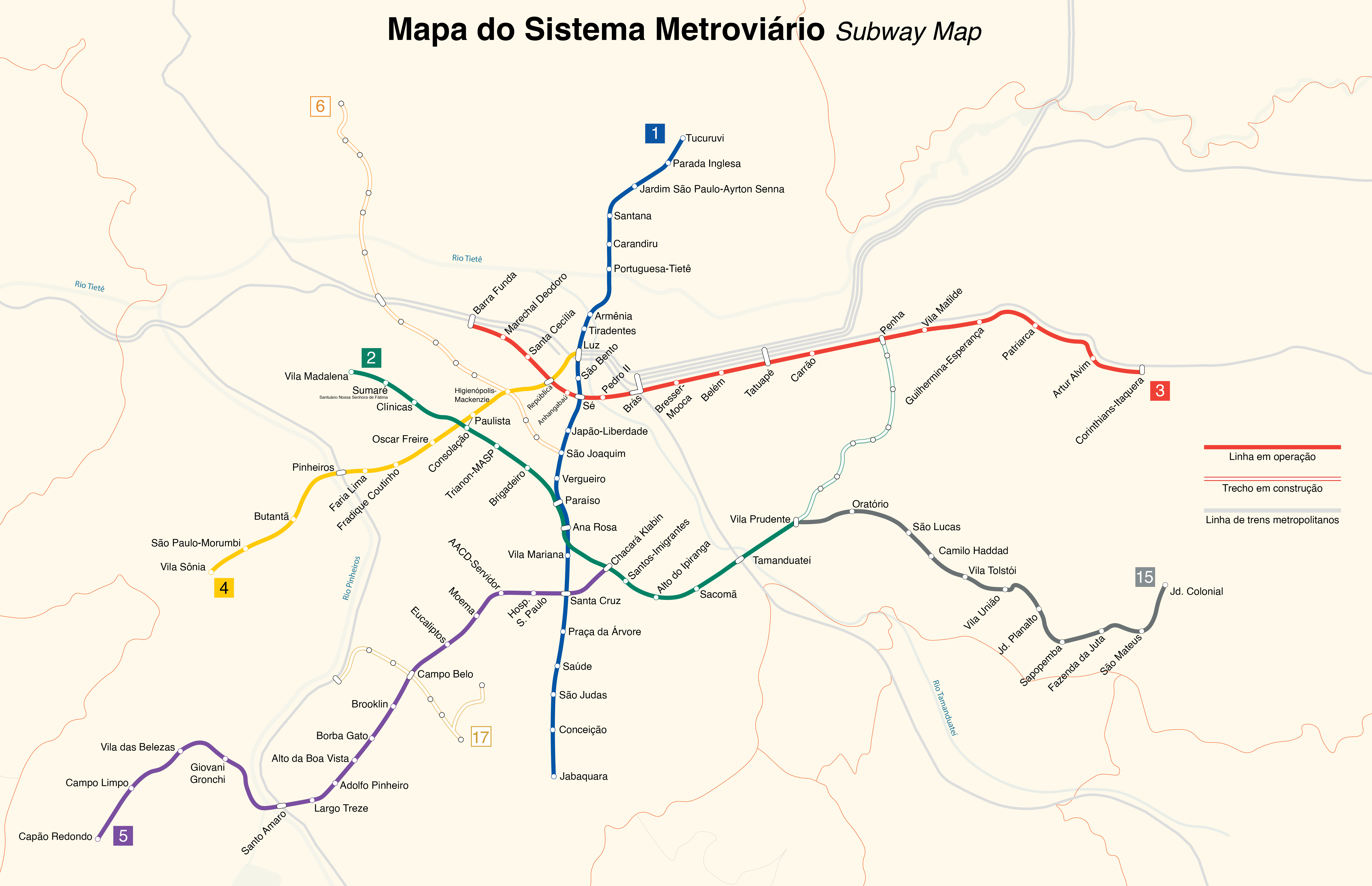 상파울루 지하철이 직영하는 노선은 1, 2, 3호선과 15호선(모노레일)뿐이다. 4호선은 "비아 콰트로사", 5호선은 "비아 모빌리다지사"에서 관리한다.