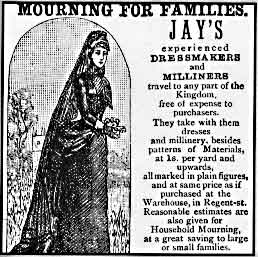 19세기 영국에서는 상류층을 중심으로 애도 행위에 대한 복잡한 규칙이 발달했다. 여성들은 '미망인의 수의'라고 불리는 무겁고 가리는 검은색 옷과 베일을 착용하는 것이 관습이었다.[25] 애도복에는 흰색 커프스, 검은색 모자 밴드, 긴 검은색 크레이프 베일과 같은 특징이 있었다.[26]특별한 검은색 모자와 보닛, 흑옥으로 만든 애도 장신구도 착용했다. 부유한 사람들은 고인의 머리카락이나 유물을 보관하는 카메오나 로켓을 착용하기도 했다.