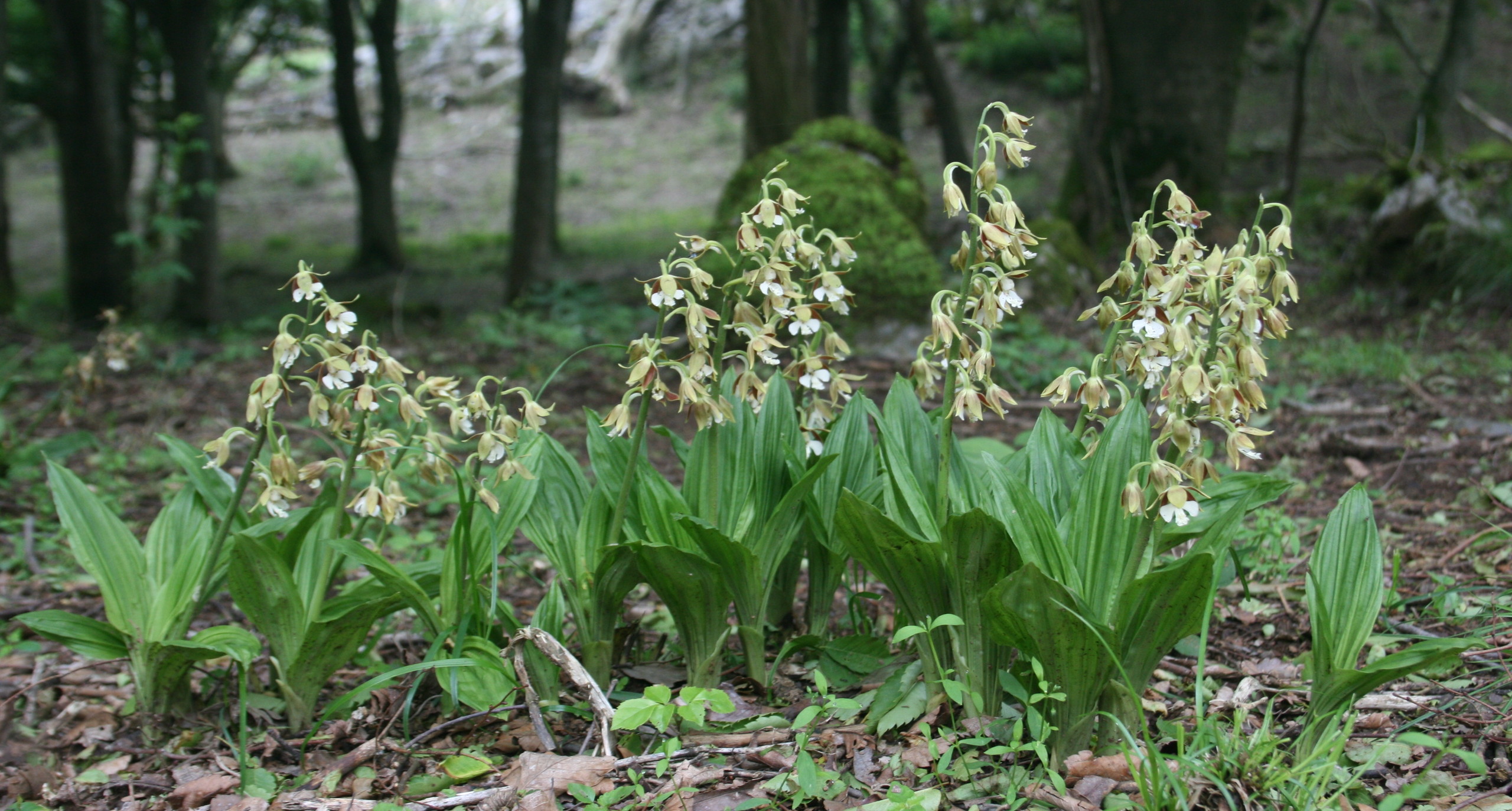 구경은 넓은 난형-구형으로 길이와 지름이 모두 약 2cm이다. 오래된 구경은 때때로 10년 이상 남아 지표면 근처에 이어진다. 이름은 이 형태를 새우에 비유한 데서 유래했다.[8] 지름 2mm~3mm의 뿌리를 다수 생성한다. 가을에는 다음 해의 새싹이 생겨 겨울까지 조금 성장한 후 월동한다. 잎은 2~3장 붙어 있으며, 얇고, 형태는 장타원형에서 도란상 피침형으로 끝이 뾰족하며, 세로로 5개의 맥이 있다. 기부는 가는 잎자루가 된다. 겨울을 넘기면 옆으로 눕지만, 수년간은 시들지 않고 남는다.[3]3. 3. 꽃