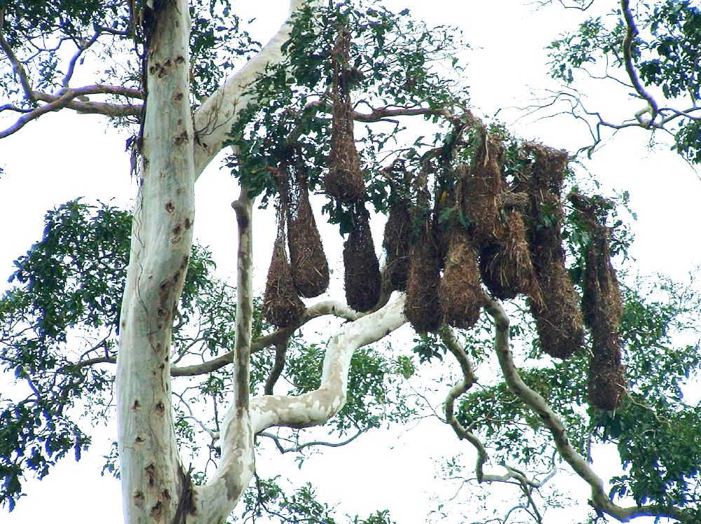 - 매달린 둥지: 아프리카의 위버(Weaver)류는 풀의 긴 줄기와 식물성 섬유로 만든 둥근 둥지를 긴 노끈 또는 새끼줄로 나뭇가지에 매단다.[1]