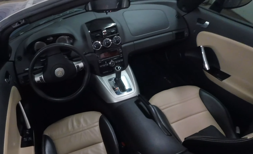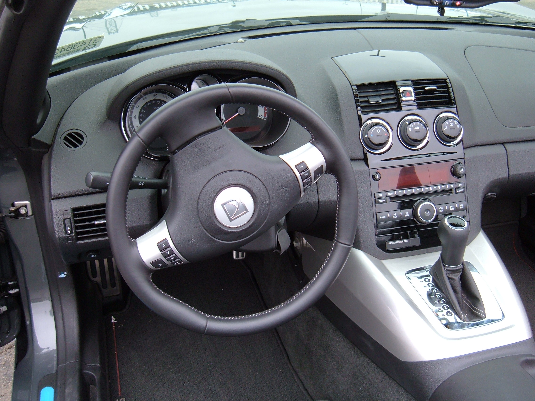 새턴 스카이의 실내는 스티어링 휠에서 시작하여 오른쪽으로 뻗어나가는 기능들을 모아놓은 솔스티스의 실내와는 달리, 차량 전체에 얇게 분산된 전통적인 버튼 배치를 선호했다. 스카이는 솔스티스보다 손잡이가 하나 적었고, 대신 잃어버린 부속품 근처에 차량의 전원 소켓을 배치했다. 두 차량은 버튼 배치 외에도 변속기, 계기판, 통풍구, 파워 윈도우/미러/잠금 제어 장치 배치, 조수석 에어백 알림 장치 배치도 달랐다.[7][8]