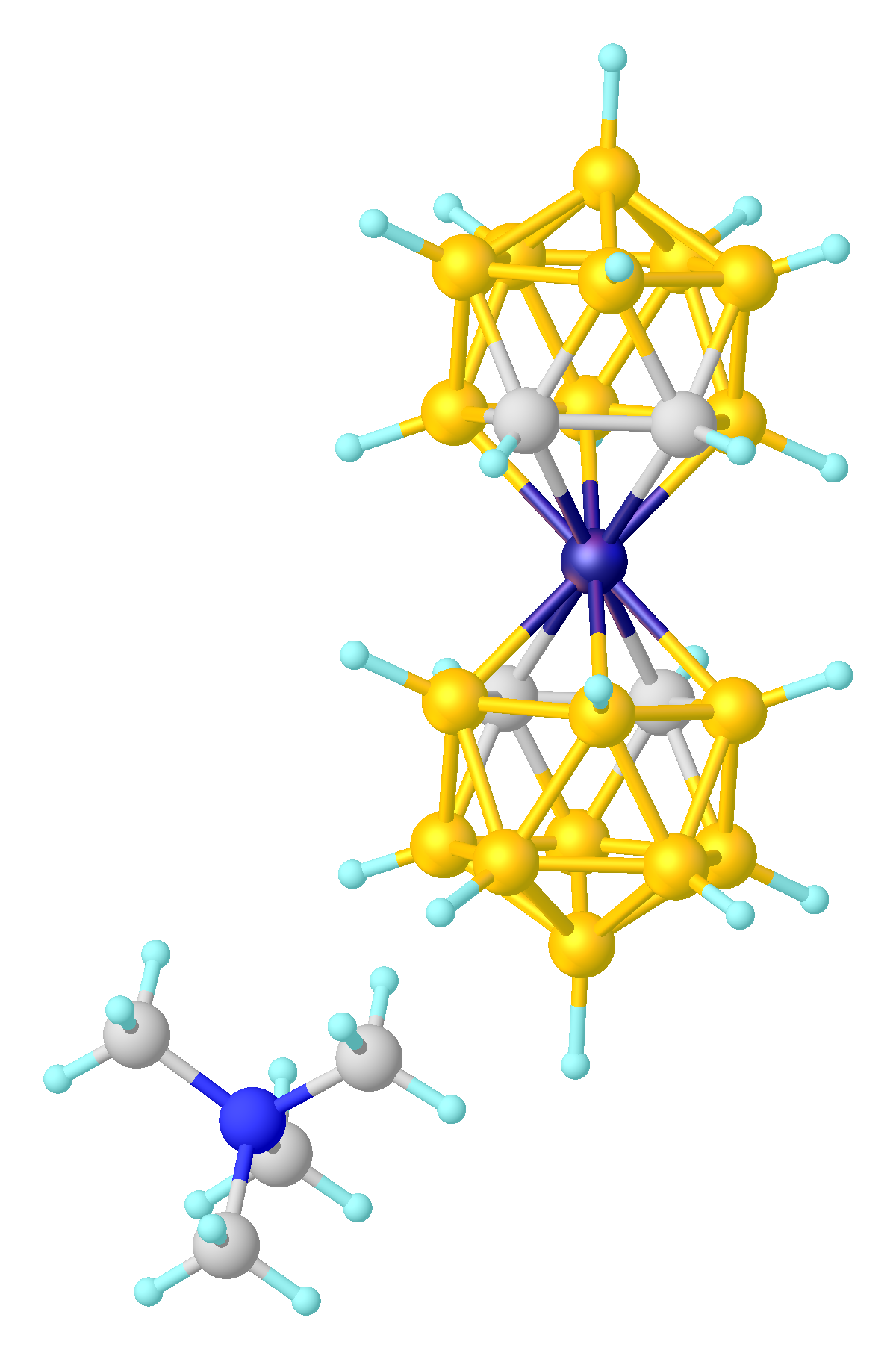 - 금속–카보란 착물(메탈라카보란), 주족 또는 전이 금속 이온이 카보란 리간드에 배위되어 크기가 6개에서 15개의 꼭지점에 이르는 다면체 케이지를 형성하는 매우 크고 다양한 계열이다. 예로는 비스(디카볼라이드) 착물,[6] 및 , 그리고 및 와 같은 작은 카보란 샌드위치가 있다. 여기서 M은 전이 금속이고 R과 R′는 메틸 또는 에틸이다.[4][5]