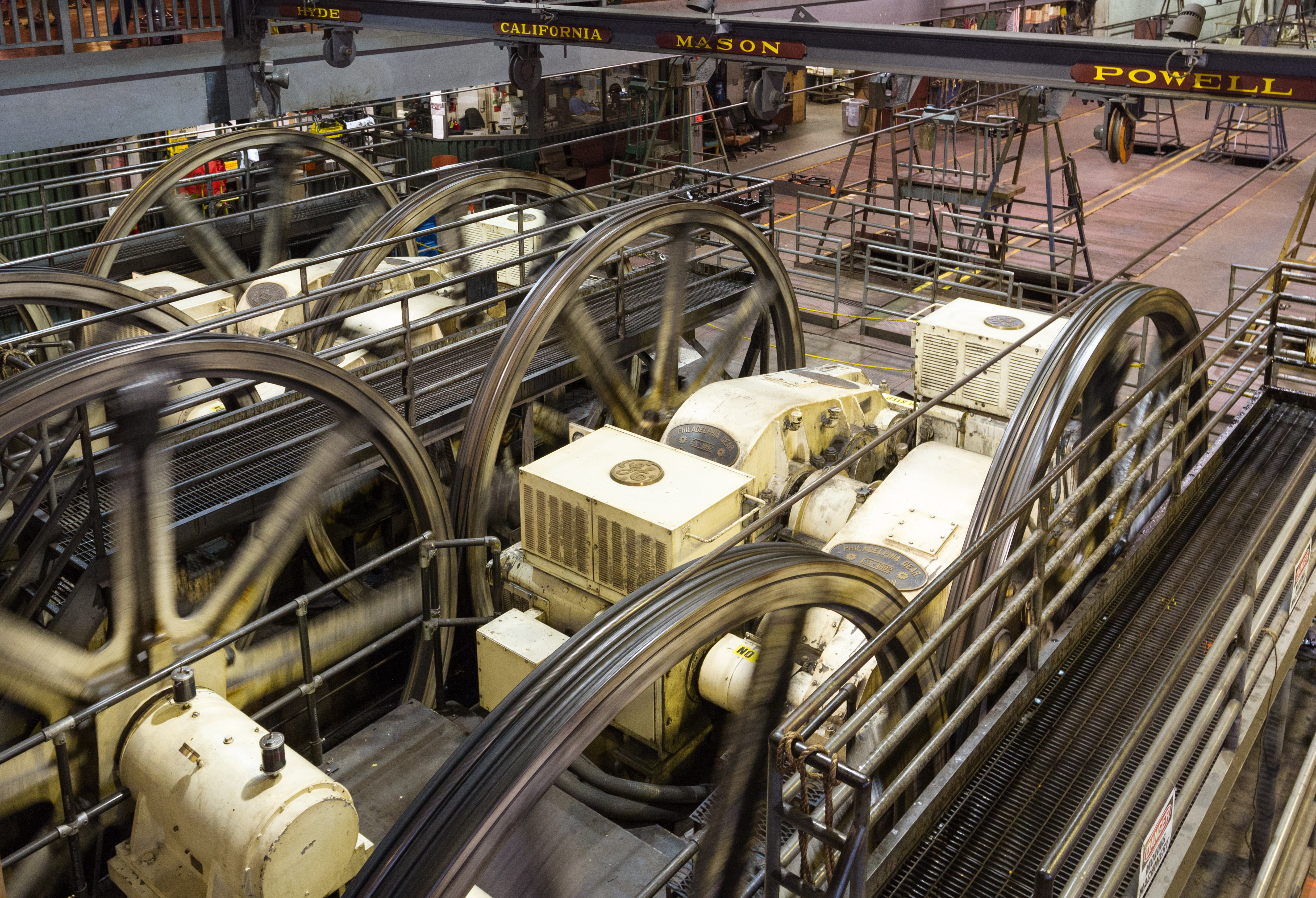 원래 케이블은 고정식 증기 기관에 의해 동력을 공급받았다.[20] 초기 세 개의 케이블을 위해 페리스 & 클리프 하우스 철도는 450hp 석탄 연소 증기 기관 2개를 수용할 수 있는 3층 구조물을 건설했다.[20] 이 건물에는 회사가 사용한 무연탄인 웨일스 탄에서 발생하는 짙은 검은 연기를 배출하기 위한 185m 굴뚝이 있었다.[20] 1890년에는 서비스 확장을 위해 500hp 석탄 연소 증기 기관 2대가 추가되었다.[20] 1893년의 석탄 소비량은 하루 약 10톤이었다.[20] 1901년에 이 시스템은 석탄에서 석유 연소 방식으로 전환되었고, 연기량이 줄어들면서 굴뚝이 약 18.29m로 짧아졌다.[20]전기 에너지는 600hp 제너럴 일렉트릭(General Electric) 모터가 가동된 1912년에 도입되었다.[20] 1926년까지 두 번째 전기 구동 장치인 750hp 제너럴 일렉트릭 모터가 설치되면서 모든 증기 케이블 운행이 종료되었다.[20] 케이블카 노선 수가 줄어들면서 단일 750hp 전기 모터가 모든 노선을 운영하게 되었다.[21][22] 이 구성의 제한 사항은 한 노선의 케이블카가 고장나면 모든 노선을 중단해야 한다는 것이었다.[22] 1984년 재건축 동안 4개의 케이블(캘리포니아, 하이드, 메이슨, 파월) 각각은 자체 510hp 전기 모터로 개별 구동되었다.[23]