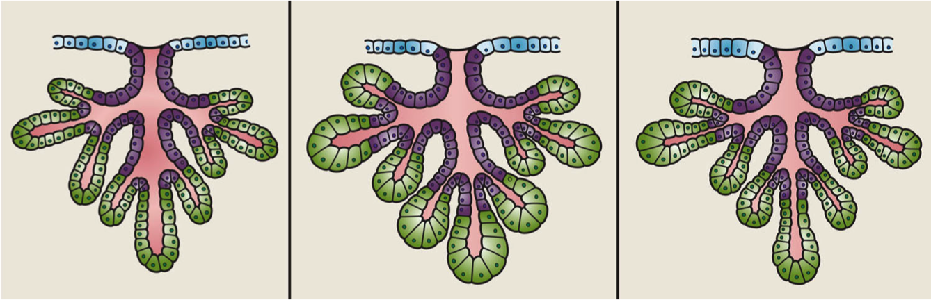 모든 선은 상피 표면에서 안으로 자라면서 형성된다. 처음에는 관상 구조를 가질 수 있지만, 세포의 고체 기둥으로 시작하여 나중에 관이 되는 경우도 있다.[3]